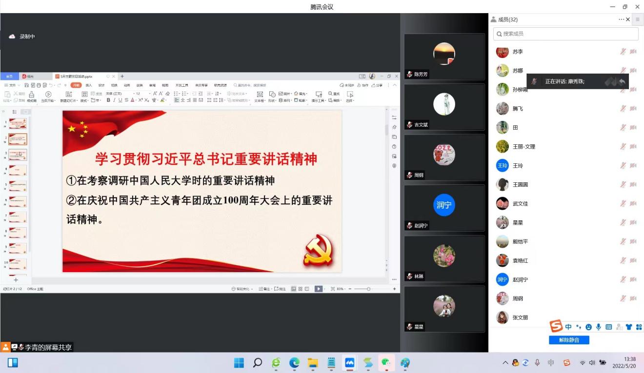 为贯彻落实学校2022年党的建设工作会议暨全面从严治党工作会议精神,5月20日文理学院举行“云上”主题党日活动,进一步统一思想、凝聚共识,推动学院各项工作顺利落实。会议由直属党支部书记康秀珠主持,学院全体党员及党风监督员参加。