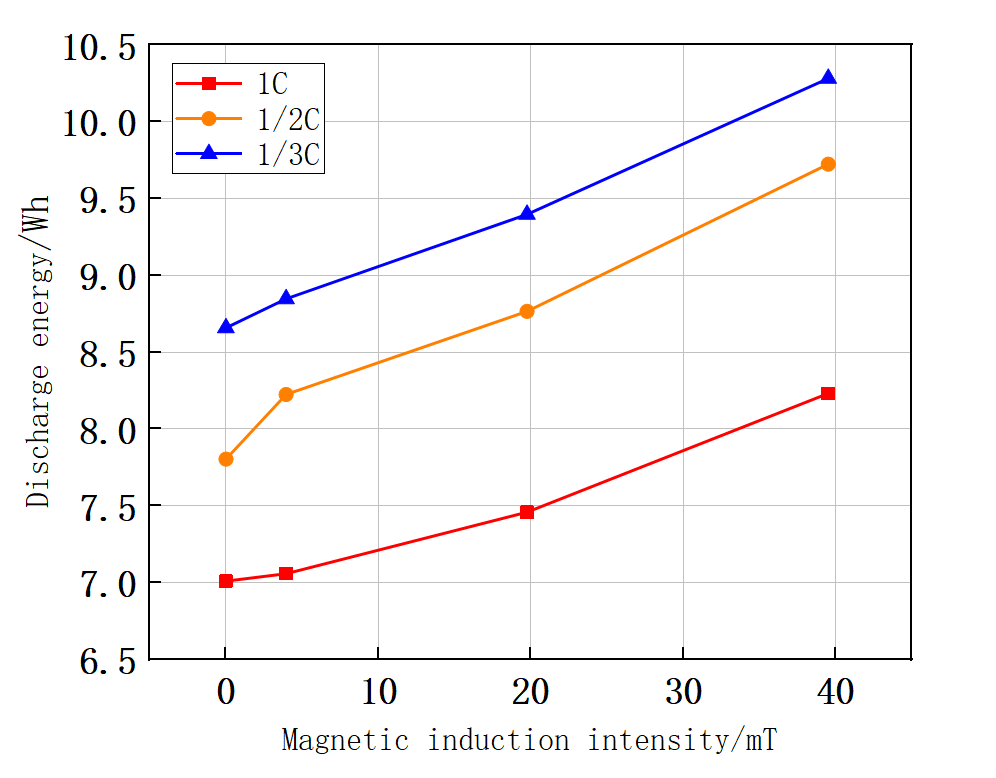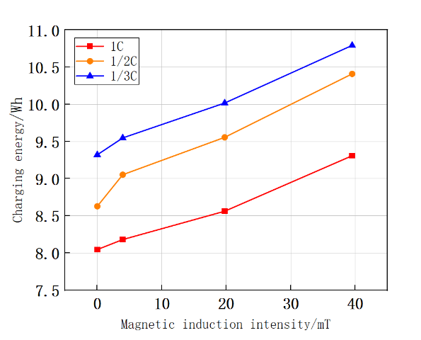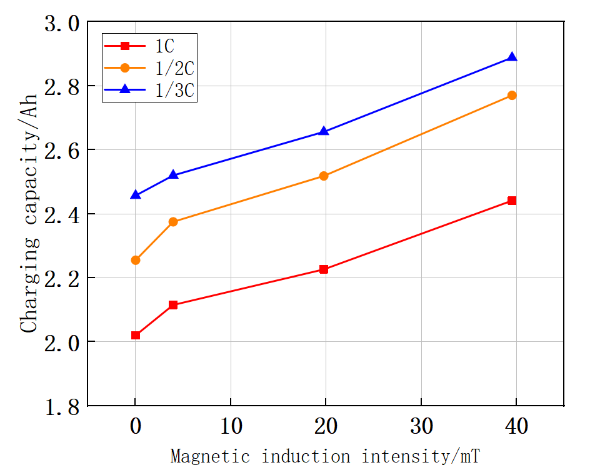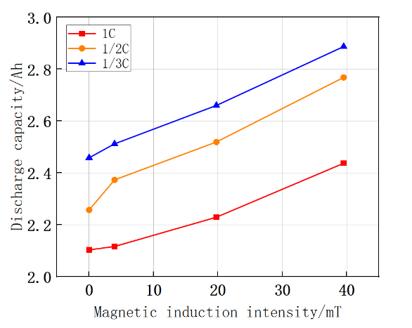 磁场效应对锂离子电池的性能有很大的影响,在不同的倍率下,以1/3C、1/2C、1C倍率为例,如图1所示。磁场具有波粒的辐射特性,当外部磁场作用于电池时,电池内部被磁化,会产生许多微小的磁偶极子,使得电池内部的颗粒物质发生磁性排列,提高离子电导率,从而加速电极附近离子的流动和扩散,进而改变锂离子电池的工作性能,不仅增加了锂离子电池的容量,同时也提高了电池的能量密度。