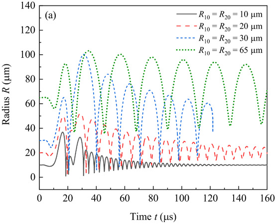 (中心频率为80 kHz的脉冲声波作用下两气泡平衡半径取不同值时(a)气泡半径变化和(b)气泡位置变化)