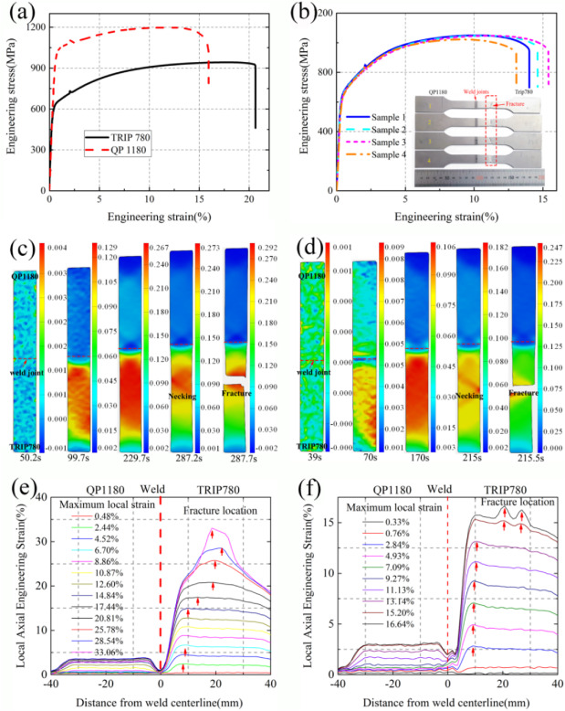 机械学院焊接团队采用数字散斑相关法(DIC),动态观测了激光焊QP1180-TRIP780超高强钢异种接头的拉伸过程,研究了其不同时刻的应力应变云图,并通过电子背散射衍射技术(EBSD)系统研究了QP1180侧和TRIP780侧,焊接前后接头不同区域的相分布。研究发现,QP1180侧亚临界热影响区因其马氏体回火率较高而导致该区域总体硬度下降;而TRIP侧则残余奥氏体发生的马氏体相变,补偿了其亚临界热影响区的马氏体回火所导致的软化,最终没有表现出软化现象。该研究系统解释了超高强度钢在焊接过程中的接头软化机理,该工作对白车身高强钢结构焊接过程中通过工艺调控获得更加优良的综合力学性能提供了借鉴。