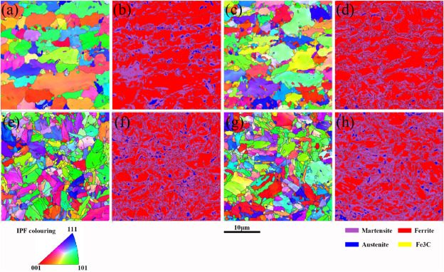 (图1 接头热影响区的电子背散射衍射反极图与相分布图)