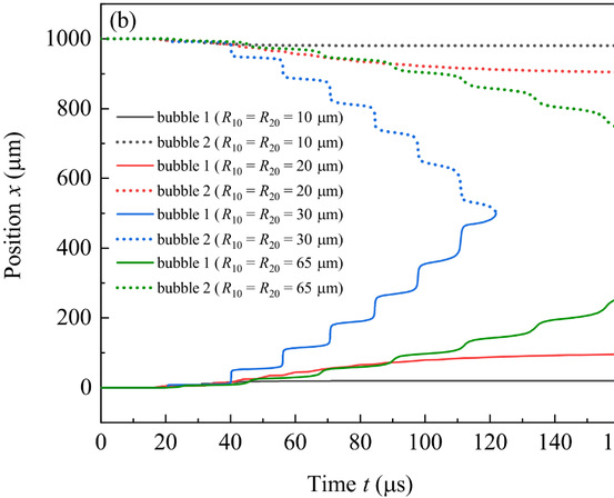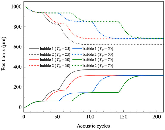 (不同时间间隔的脉冲声波串作用下两气泡位置变化)