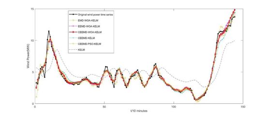 电气学院自动化系丁云飞团队针对风电时间序列信号的间歇性和波动性,提出了一种基于总体平均经验模式分解和基于改进的鲸鱼优化算法的核极限学习机的混合预测模型,用于预测短期风电功率。该模型将非平稳风电时间序列分解为一系列相对平稳的分量,通过改进的鲸鱼算法优化初始值和阈值,最后叠加预测输出值以获得风功率值的最终预测。该预测模型不仅能够降低预测的复杂度,而且在预测精度和稳定性方面,性能更高,计算成本更低,从而能够降低风电备用容量,实现电网及风电场的安全高效运行。