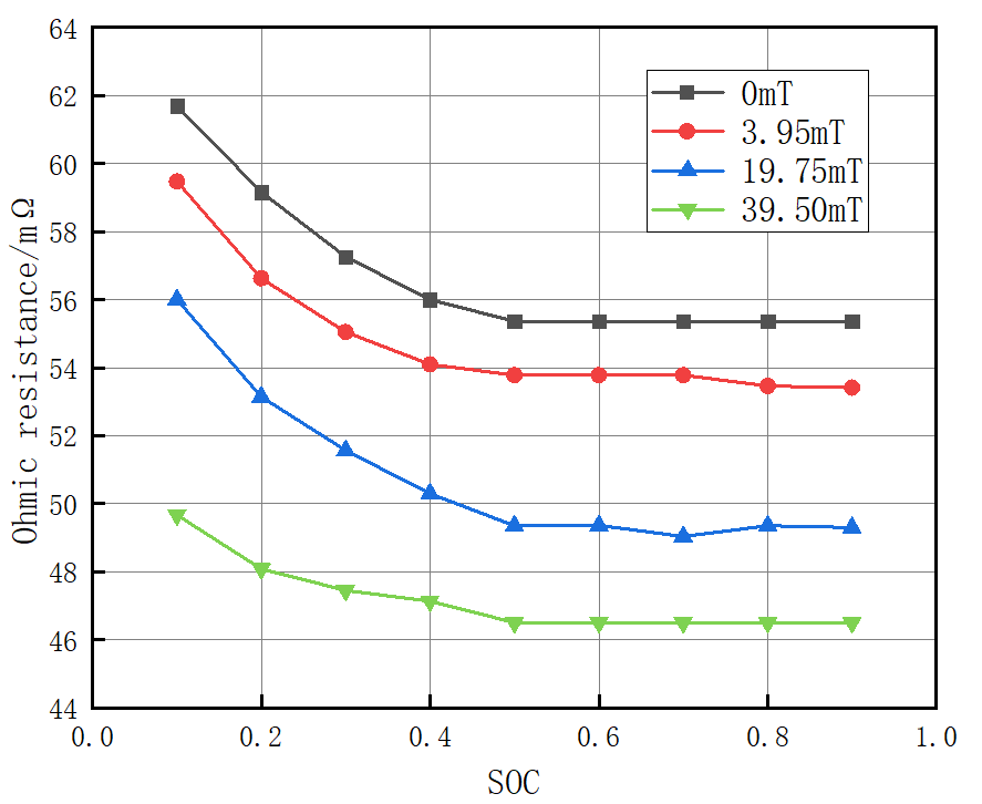 图2反映的是放电时电池的欧姆内阻和极化内阻随SOC的变化情况,在放电过程中,由于受到磁场的作用,电池内部会被磁化,产生许多微小的磁偶极子,使得电池中的颗粒物质发生磁性排列,提高离子电导率,离子移动速度变快,所以电解液中的欧姆内阻变小,而电解液的内阻是欧姆内阻的主要组成部分,由于离子移动速度变快,所以电池化学反应速度也变快,从而电池的极化内阻也变小。