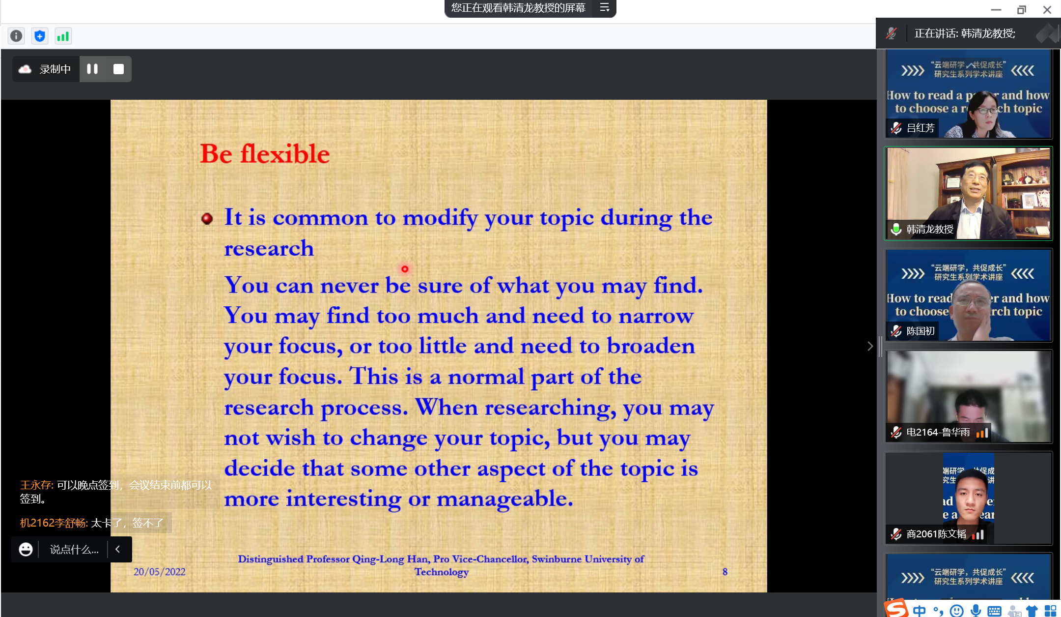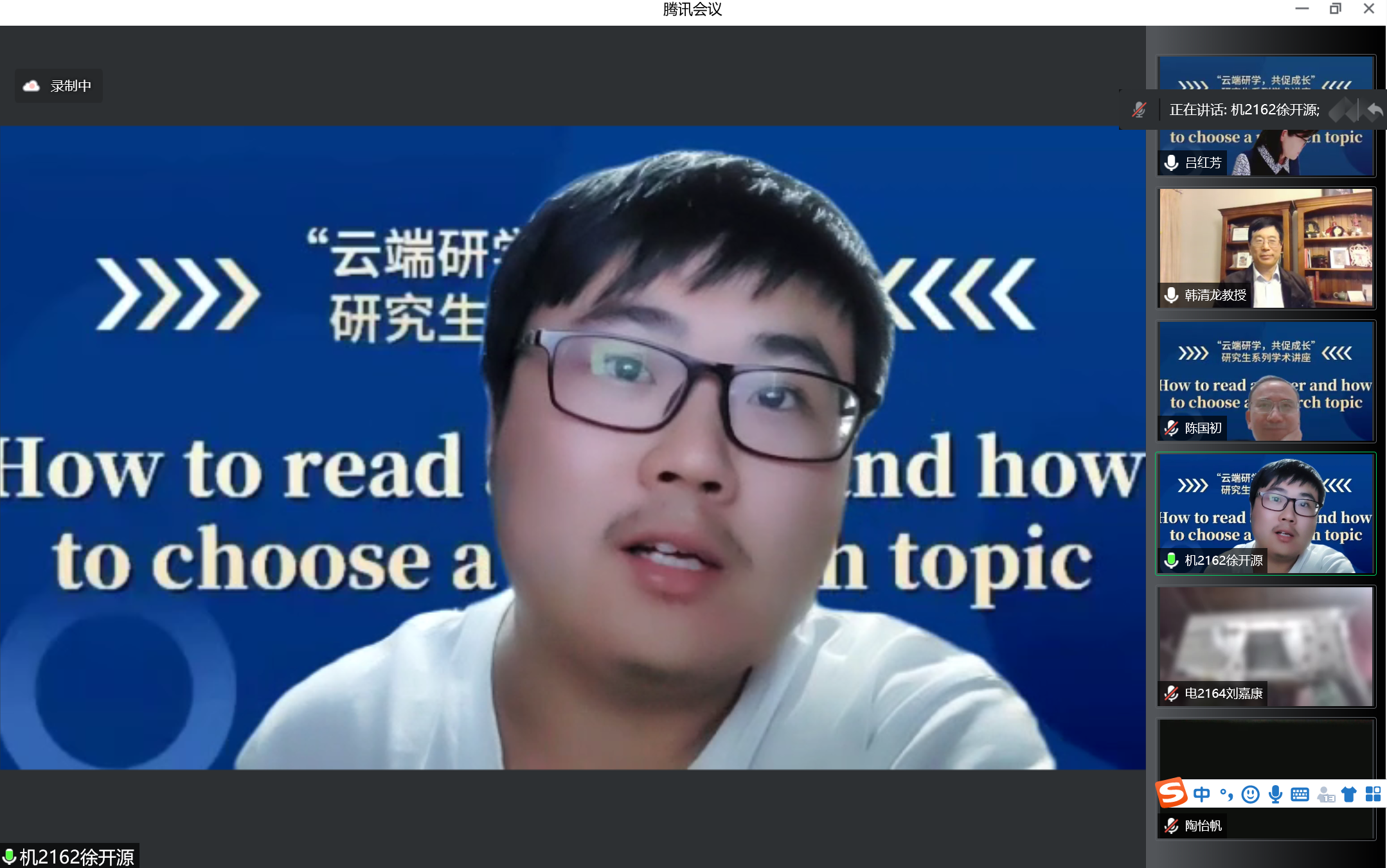韩清龙教授则更“接地气”,他从想法的产生、背景资料的阅读、关键词清单、主题的定义和论点的阐明等方面详细介绍了论文如何选题,并从阅读文章概要、抓住文章内容、深入理解文章三个步骤详细阐述了如何有效阅读一篇文献。