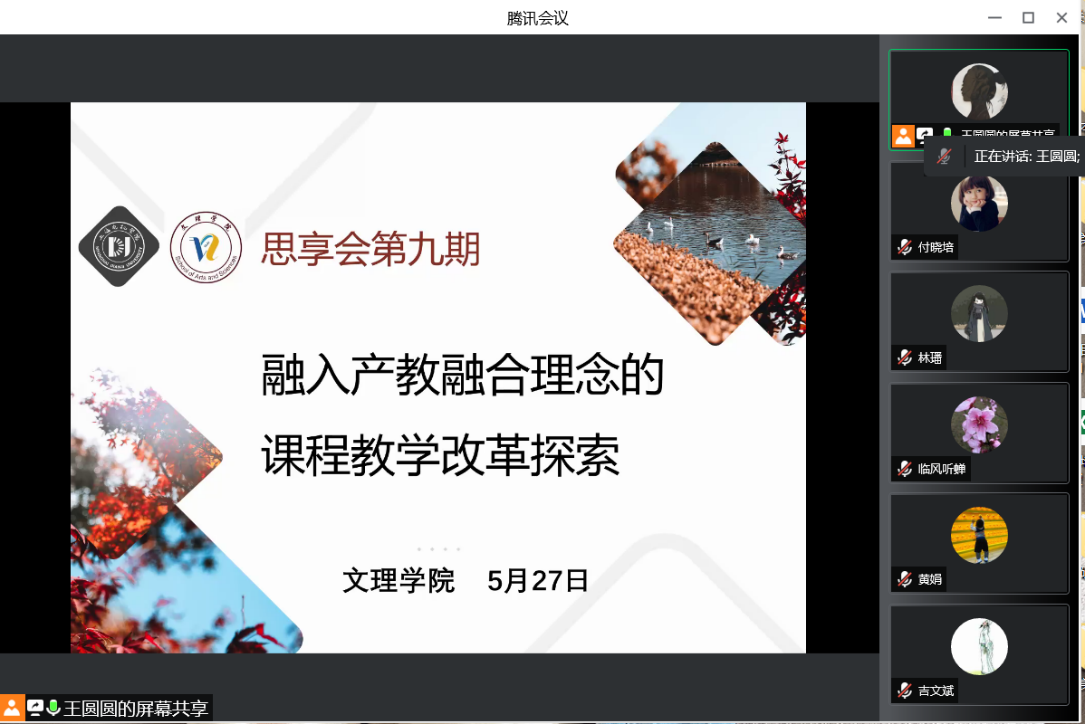 为深入推进落实产教融合新理念,不断创新基础课及通识课教学模式,助力提升应用型人才培养质量,文理学院于5月27日举行“融入产教融合理念的课堂教学改革探索”的教学思享会,文理学院院长朱泰英、直属党支部书记康秀珠、副院长吉文斌,教务处认证评估科科长付晓培,以及学院各课程团队负责人、骨干教师等参加本次分享会。