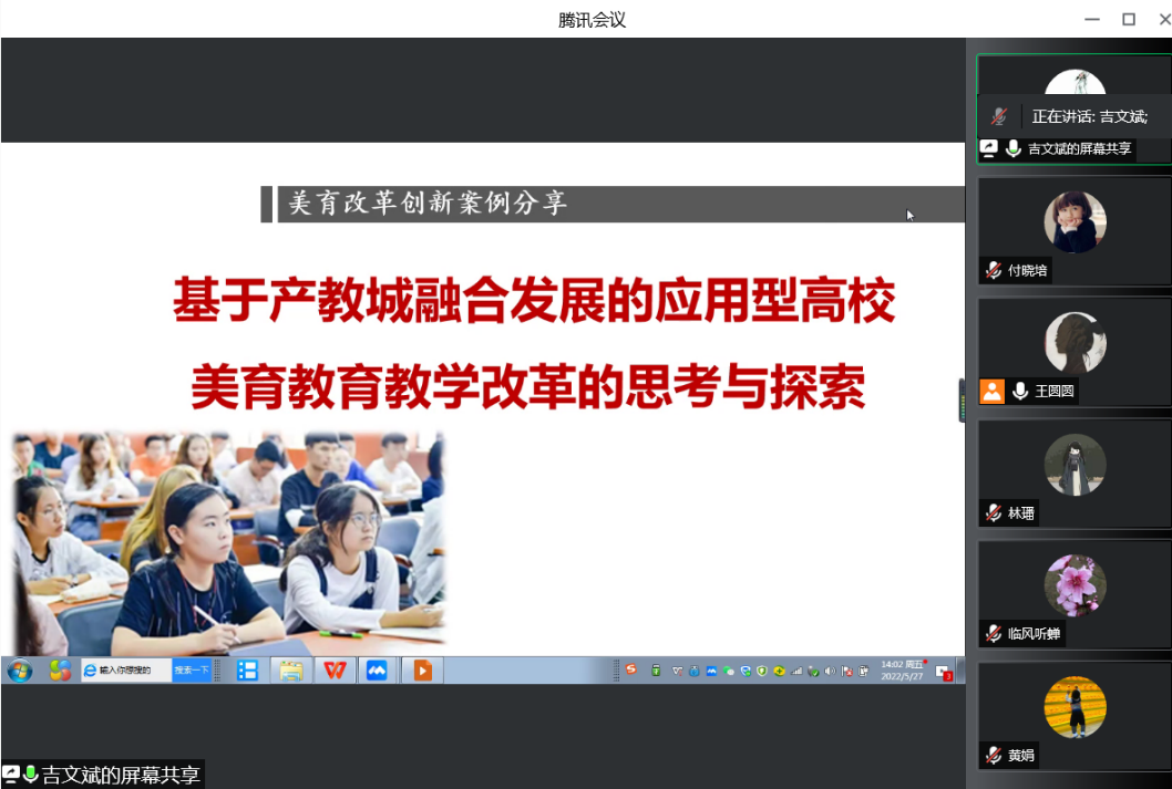 会上,吉文斌以“全国第六届大艺展国家级二等奖”美育改革创新案例《基于产教城融合发展的应用型高校美育教育教学改革的思考与探索》为主题,结合“诗意人生”美育课程群建设,介绍了基于产教城融合发展的应用型高校“三圈四共”螺旋上升、和谐共生的大学生美育教育体系,涵盖了课程建设的从背景、到设计、到实施、到反馈、到再设计的良性闭环过程,充分体现了“产教城融合+美育”的改革成效。