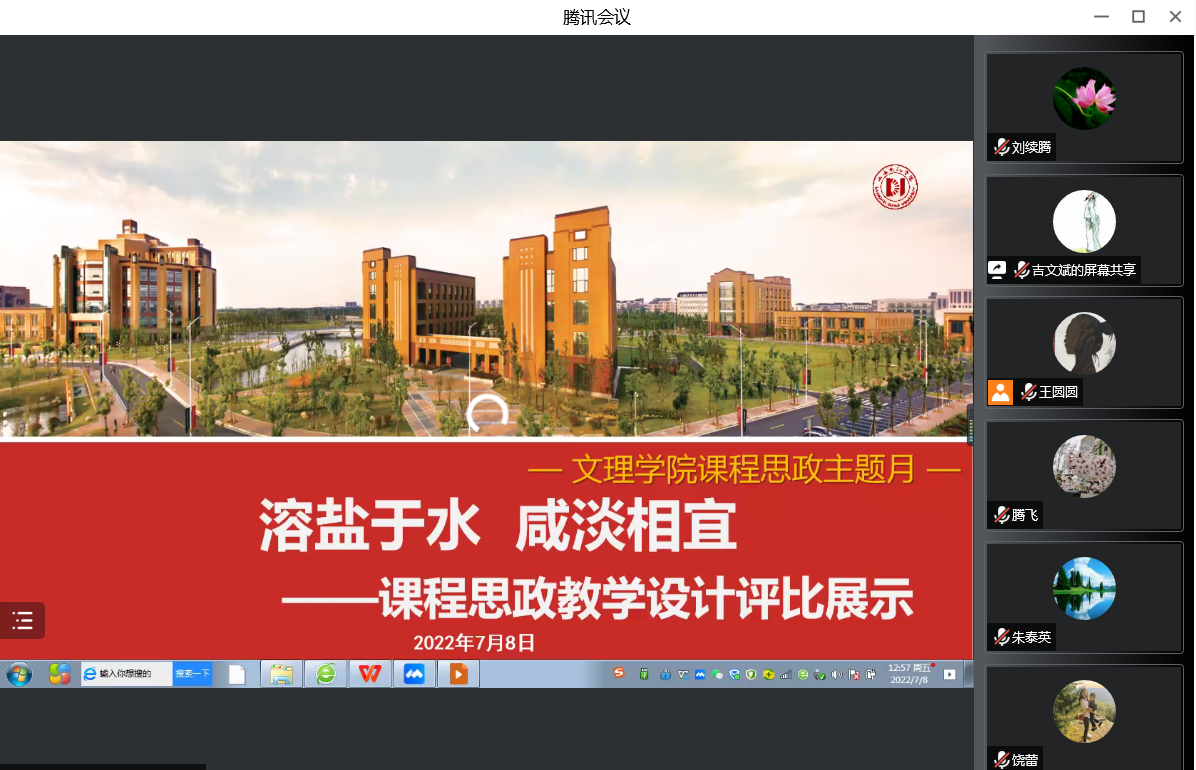 为进一步落实立德树人根本任务,充分发挥课堂教学育人的主渠道、主阵地作用,促进基础课程教育与思政教学有机融合,自6月初以来,文理学院顺利开展“课程思政主题月”活动。7月8日,主题月收官活动——“文理学院课程思政教学设计评比展示”以线上方式举行,特邀学校党委办公室主任、首批校级课程思政教学团队负责人董雪静,教务处副处长饶蕾,资深教授刘三明担任评委,文理学院院长朱泰英、直属党支部书记康秀珠、全院教师及兄弟学院相关教师参加本次活动,活动由副院长吉文斌主持。