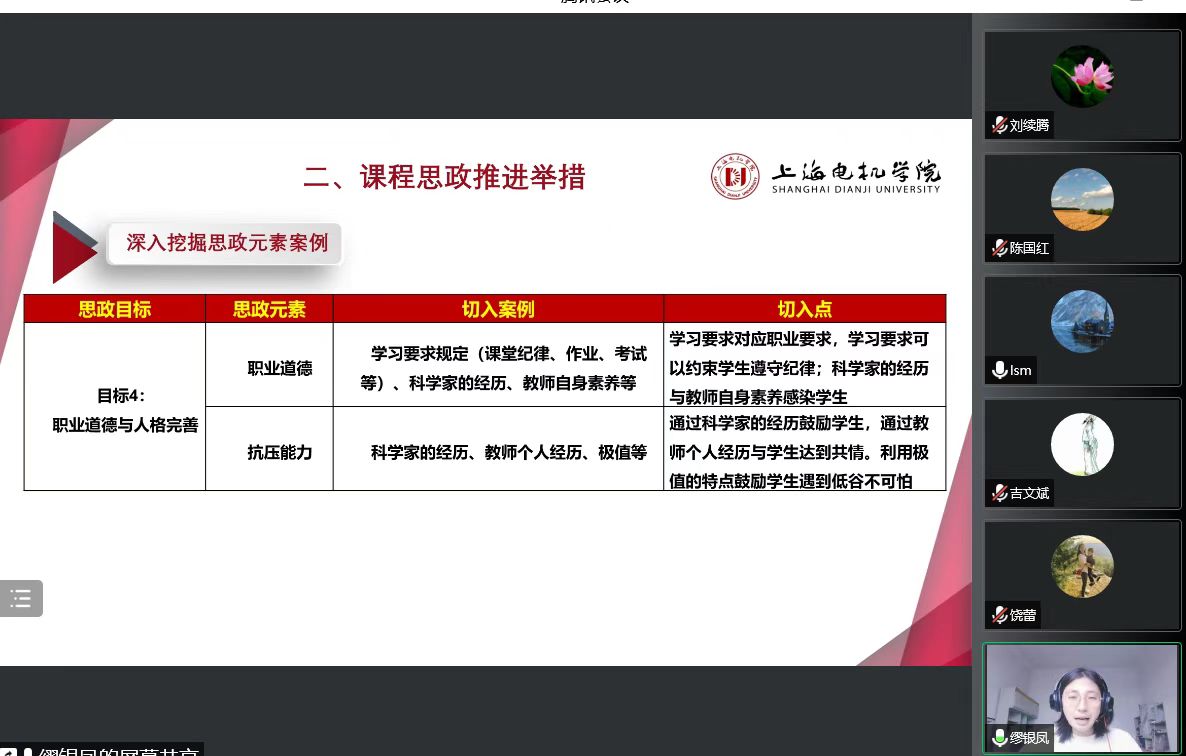 参加此次展示活动的是由各教研室推选的6位教师,她们分别通过说课的形式展示了各自课程思政改革的设计思路,阐释了课堂教学中将课程思政内容与专业知识有机融合的教学模式和教学方法,各有侧重,各具特色。