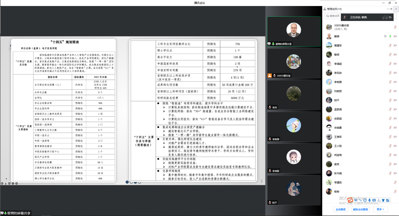 会议伊始,蔡骋院长就电子信息学院十四五规划修订情况做了详细的报告。他从十三五的经验和存在的问题出发,肯定了学院在十三五期间在重视青年教师培养、注重以竞赛牵引促学风中做出的成绩,同时也指出了师资队伍结构不合理、实践教学环境亟待改善、高水平科研成果数量不多分布不均衡等问题,提出了十四五培养面向集成电路制造业及相关信息产业的多学科交叉应用型人才、构建中国集成电路制造业需求驱动的留学就业产教融合新模式、成为临港新片区“一带一路”“国家留学就业的合作平台”的使命,成为集成电路智能制造、测试和应用领域人才培养基地的愿景,以及发挥区域优势和政策优势打造留学就业一体化适用型人才培养的特色品牌和“AI+”下沉做基石,支撑主干学科发展,赋能智慧教育及智慧校园建设的内外循环的定位。