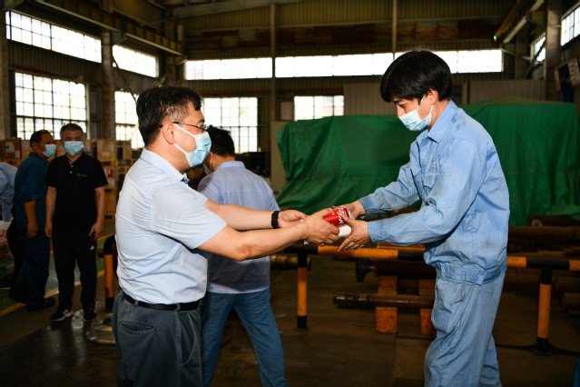 在上海昂电电机有限公司,校领导慰问了厂房内忙碌工作的企业员工,叮嘱大家要做好高温天气作业的劳动防护工作。昂电实业公司总经理王峰代表企业感谢学校在疫情期间提供的大力支持,汇报了有关项目建设进度,以及企业克服疫情影响保障业务推进的各项工作。