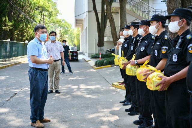 在闵行校区,学校领导看望了高温下仍然常态化坚守校园的安保人员、食堂员工、维修人员、宿管阿姨,现场了解他们的工作和生活情况,并送上消暑用品。鲁雄刚代表学校对他们不畏高温酷暑、严谨细致工作、坚守工作岗位表示衷心感谢,叮嘱大家要严格落实落细学校各项疫情防控措施和暑期工作任务,同时要注意高温环境下的防暑降温,劳逸结合,合理安排工作和休息时间,做好自身安全防护,守护校园平安。