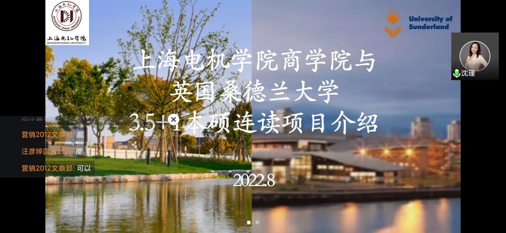 为进一步推动学院国际化发展,拓宽学生国际化视野,更好地指导应届毕业生实现高质量就业,8月16日晚,上海电机学院商学院与英国桑德兰大学“3.5+1”本硕连读项目宣讲会于腾讯会议平台成功举办。商学院党委副书记、副院长沈瑾,英国桑德兰大学华东联合办公室项目经理金晨星以及商学院毕业班辅导员代表、学生代表等50余人参加了宣讲活动。