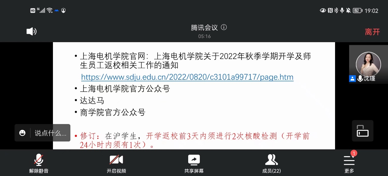 会议第一阶段,沈瑾围绕《上海电机学院关于2022年秋季学期开学及师生员工返校相关工作的通知》进行详细解读,对不同年级开学返校时间、学生返校流程、疫情防控背景下不同地区师生分类管理要求、健康打卡、学费缴纳、宿舍搬迁以及四六级考试等师生关注热点专门做详细说明。同时,沈瑾对家庭困难学生关心、学生心理健康、安全教育、纪律管理、学风建设、实习就业等学期常规工作做进一步提示和强调。