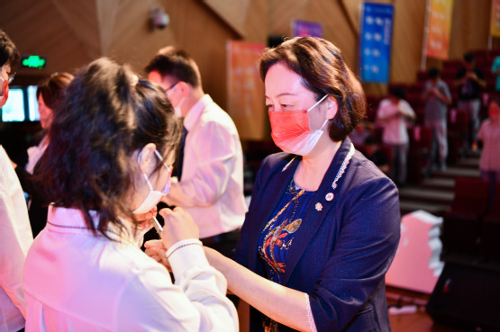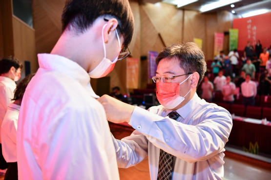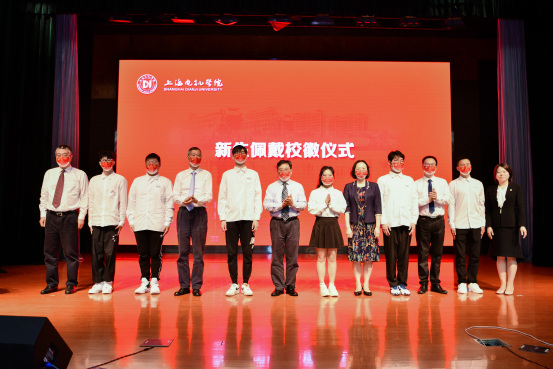 在校徽佩戴仪式环节,全体校领导为新生代表佩戴校徽,所有在场和在线观看典礼的同学自行佩戴。通过佩戴校徽,大家表示将承载着电机人的使命与荣光,脚踏实地,砥砺前行。