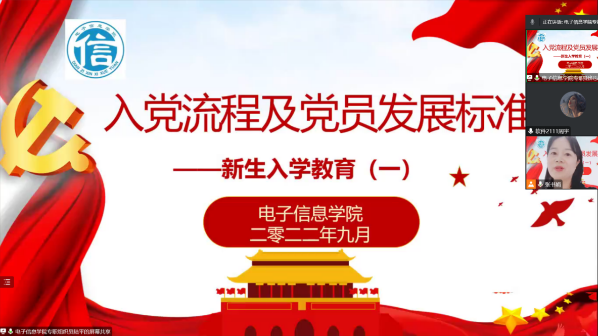 为强化学生的理想信念教育,激发学生政治热情和入党意愿,引导新生端正入党动机,了解入党流程,积极向党组织靠拢,电子信息学院于9月28日晚18:30,通过线上线下相结合的方式,组织全体新生开展入党启蒙教育,上好新生政治信仰第一课。
