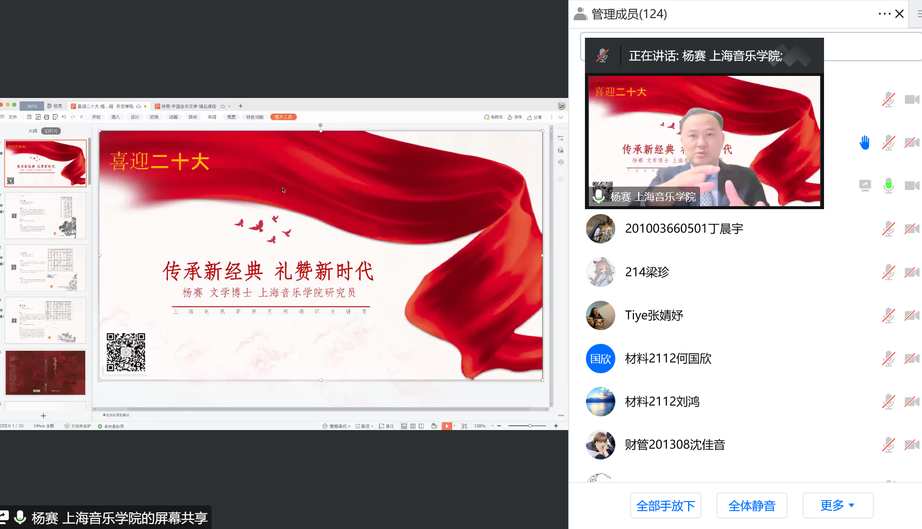 董雪静教授对讲座进行了点评。她指出,“兴于诗,立于礼,成于乐”,中华民族自古以来重视美育对人和社会发展的重要意义,本场讲座是电机校园里的一道特色“美育风景线”。杨赛老师的专题讲座让同学们对中华优秀传统文化、中国新时代精神与中国新时代音乐有了更深的理解,也激励电机学子弘扬中华美育精神,筑牢理想之基、坚定信念之魂、补足精神之钙,唱响新时代中国精神,以实际行动迎接党的二十大胜利召开、迎接我校70周年校庆隆重到来。