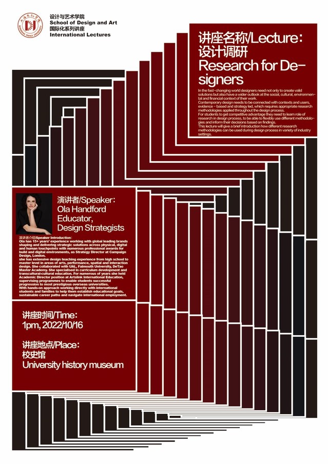 她在艺术,表演,空间和交互设计领域拥有丰富的设计教学经验。.她曾与UAL,法尔茅斯大学,德稻大师学院合作。她专门从事课程开发和跨文化文化教育。 多年来,她在Artslink国际教育担任学术总监一职,监督课程,使学生能够成功升读最负盛名的海外大学。