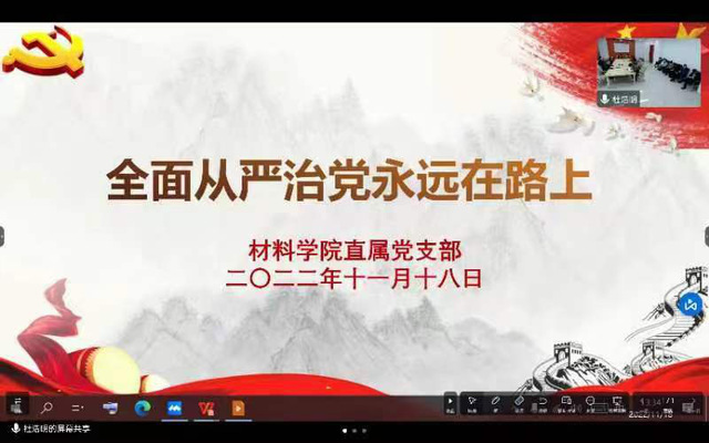 2022年11月18日,材料学院直属党支部举行“全面从严治党永远在路上”党风廉政专题教育活动,材料学院党政班子、全体党员通过线上线下相结合的方式参加此次活动。