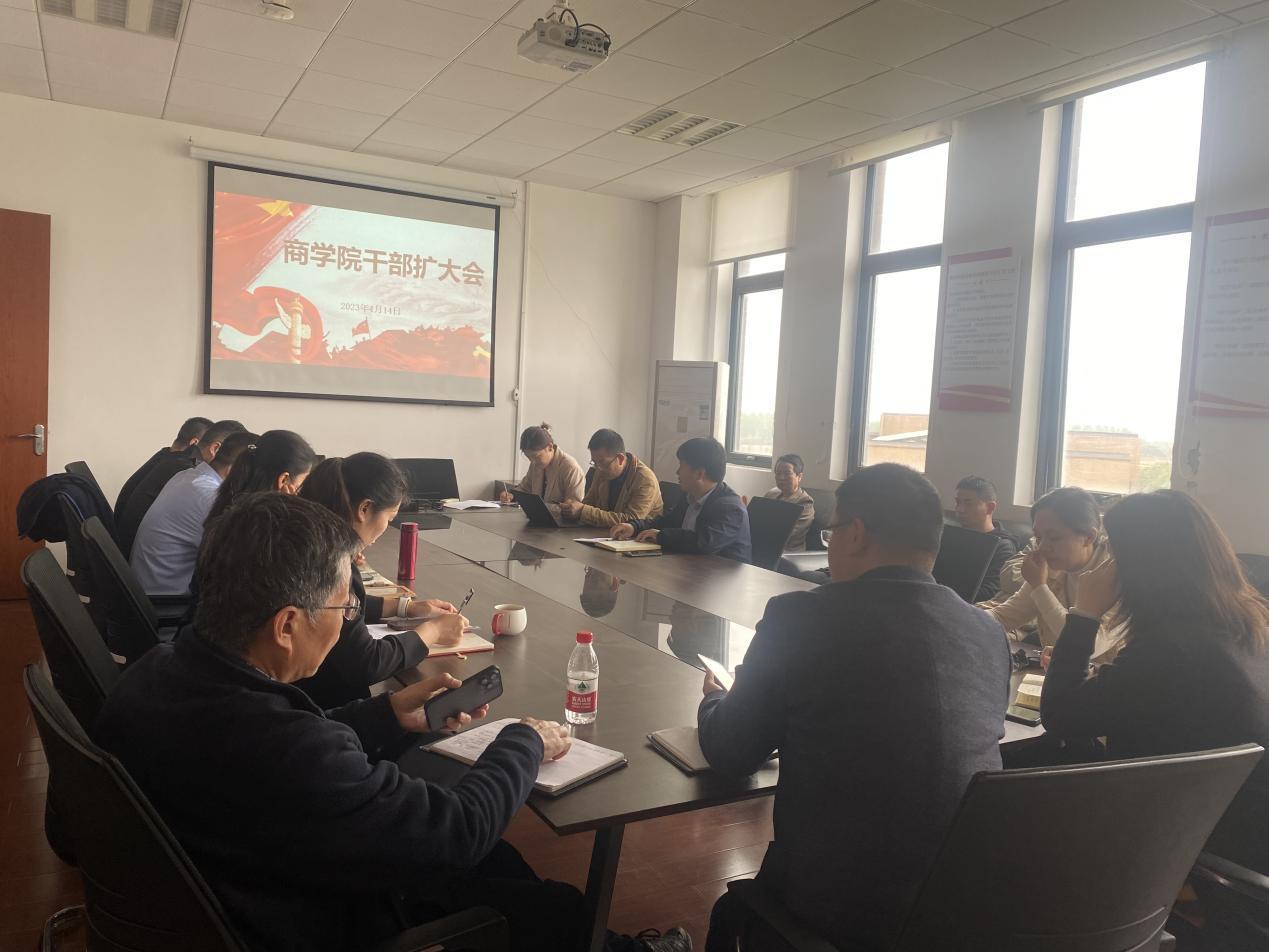 4月14日下午,商学院在学院楼502室召开干部扩大会,贯彻落实学校近期重要会议精神,部署学校和学院主要工作,学院党政班子、党委委员、三级机构负责人、教研室主任、教师党支部书记及教授代表等参会,党委书记金辉主持会议。