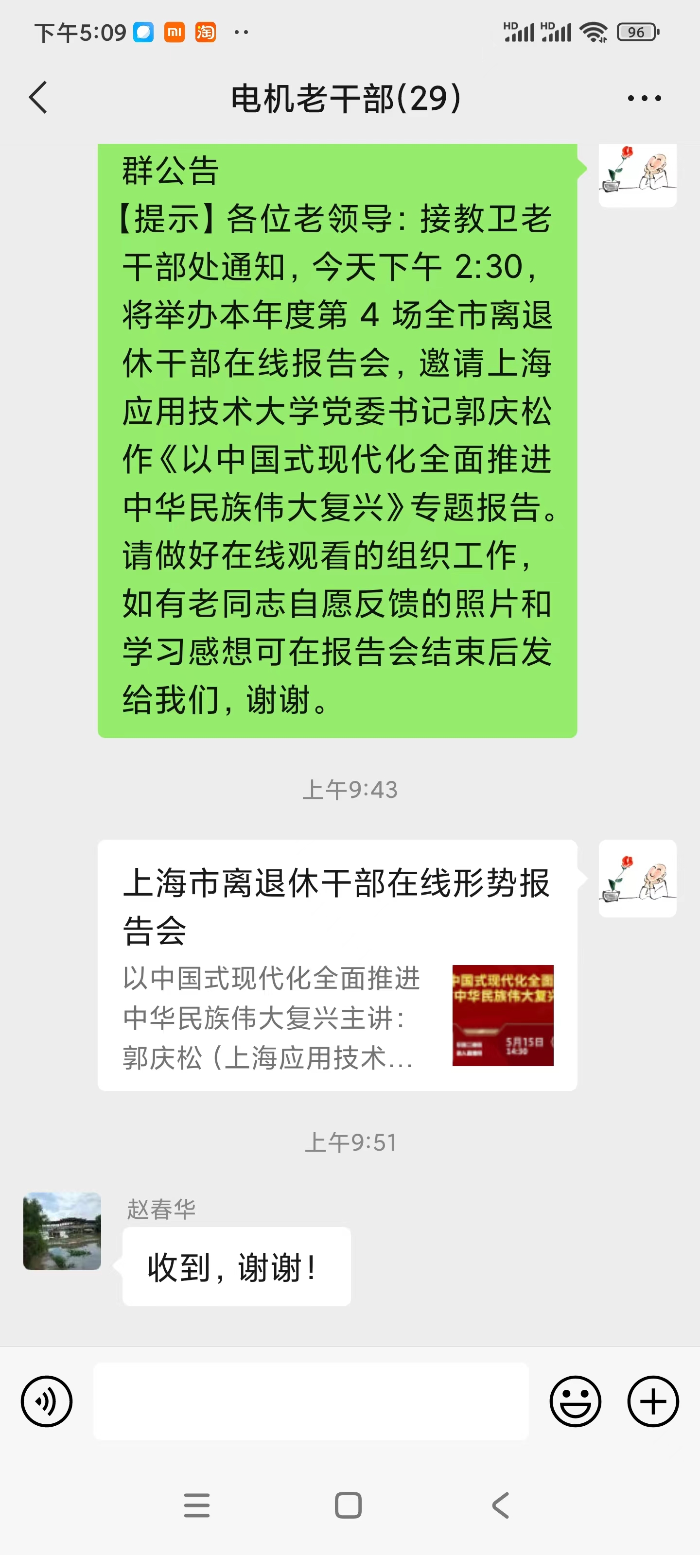 自主题教育开展以来,老干部直属党支部深刻领会开展主题教育的重大意义,积极贯彻落实“学思想、强党性、重实践、建新功”的总要求,结合老干部的实际情况开展各项活动。5月15日下午,老干部直属党支部组织老干部收看了教卫老干部处邀请上海应用技术大学党委书记郭庆松作的“以中国式现代化全面推进中华民族伟大复兴”线上专题报告。