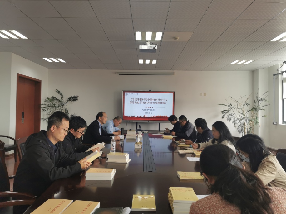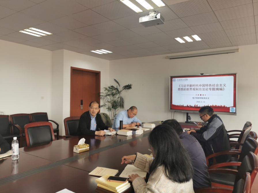 5月12日上午,电子信息学院党总支在信息楼503会议室开展学习贯彻习近平新时代中国特色社会主义思想主题教育读书班集体学习,专题学习研讨《习近平新时代中国特色社会主义思想的世界观和方法论专题摘编》。党总支书记蒋建军主持学习,学院党政班子、总支委员、各支部书记参加学习并积极展开讨论和交流。