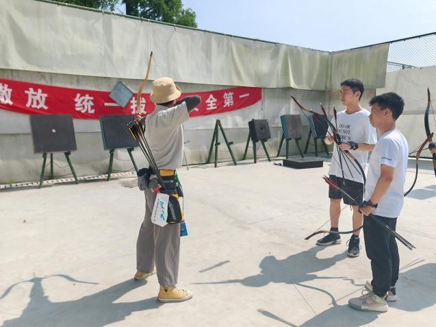 体育教学部直属党支部派出了以党员干部为主、其他骨干教师参加的志愿者团队,他们是校龙舟队教练、党小组长陈意华老师,健康服务教研室主任、射艺队教练黄琳老师,组织员、毽球队教练侯伟民老师,以及飞镖队教练毛伟胜老师。四位老师和学生队员志愿者一起,在各自场地上,开展宣传推广,共计服务了19场。炎炎烈日下,服务团队耐心、细致地给予体验者一对一、一对多的动作纠偏和指导。