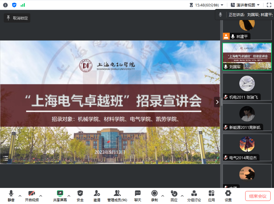 9月13日晚上7时,机械学院在线上举办了“上海电气卓越班”选拔宣讲会。会议由机械学院副书记刘国军主持,机械学院副院长赵爽、核电集团朱辉宇和来自机械学院、材料学院、电气学院、凯劳学院四个学院的2024届毕业生参加了会议。