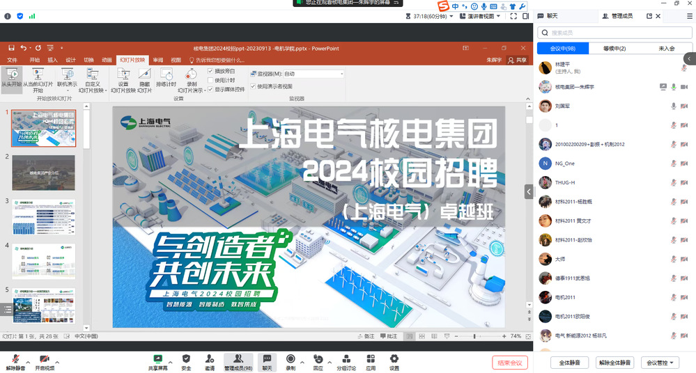 赵爽老师从项目情况、培养方式和选拔机制三个方面进行介绍。随后,上海电气核电集团招录负责人朱辉宇老师以“以创造者,共创未来”为主题,从发展历程、集团概况、职业发展、电气优势等方面进行了精彩宣讲。