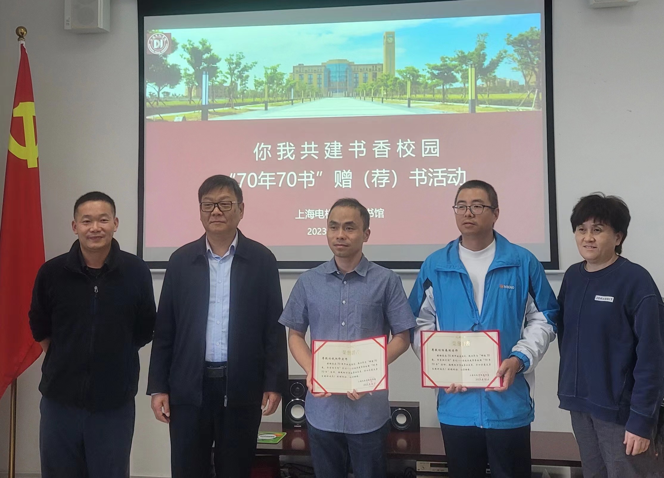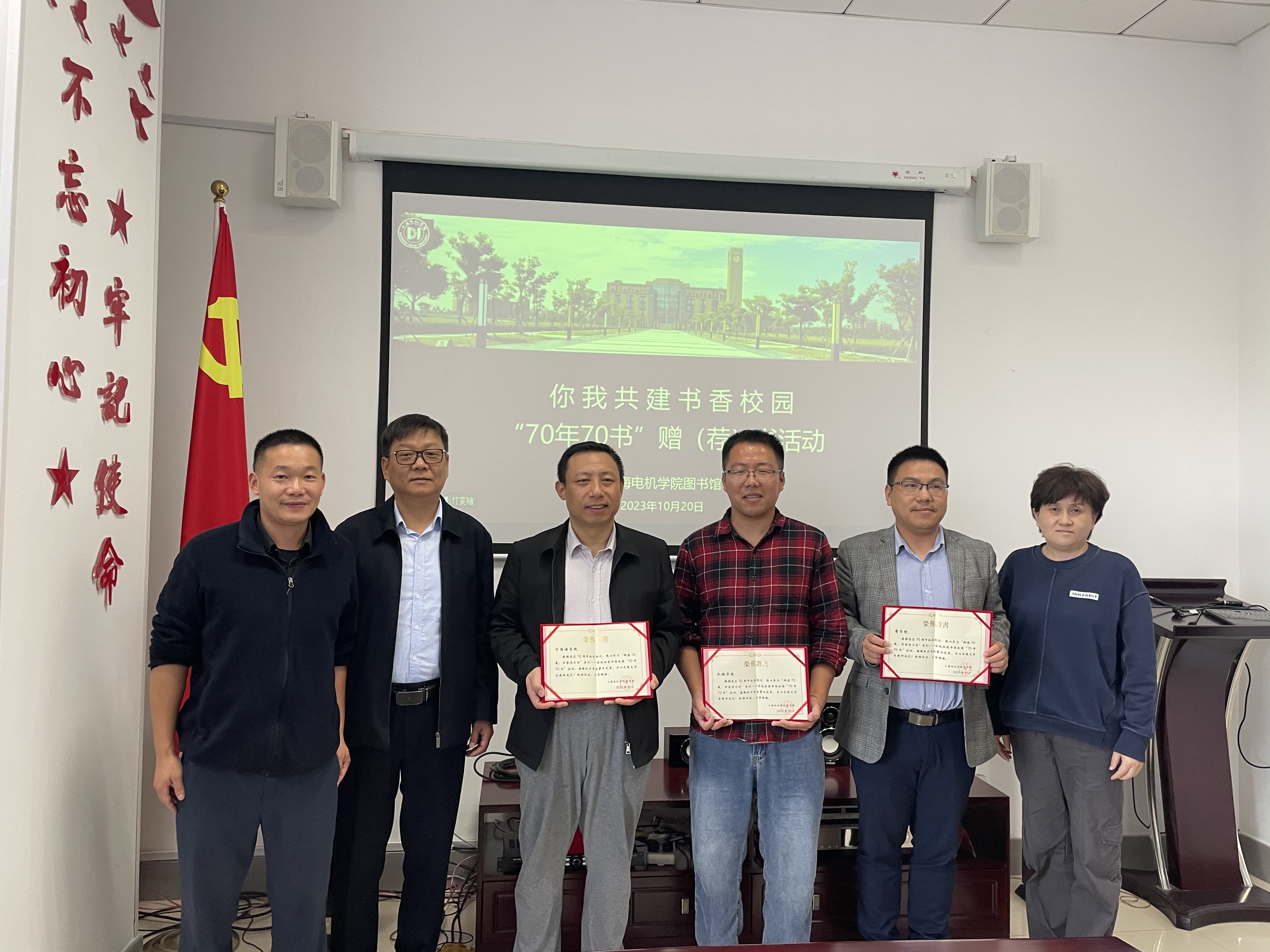 图书馆一直致力于为师生阅读构建一流的资源和平台,在校庆之际,积极策划并隆重推出以“辉煌七十载 书香润月河”为主题的上海电机学院2023年度“阅电机•悦共读”系列阅读推广活动,你我共建书香校园 “70年70书”赠(荐)书是其中重要的主题活动之一。仪式上赠(荐)书学院及教师代表畅谈活动感言,他们表示,书籍是进步的阶梯,传承是电机的血脉,逢70周年校庆之际,广大师生及校友渴望为学校做贡献,哪怕是一点点微光凝聚,也会汇聚成磅礴力量。图书馆对积极参与到活动中的学院、教师以及校友表达了由衷的感谢,并向所有参与活动的集体及个人颁授了图书捐赠证书。