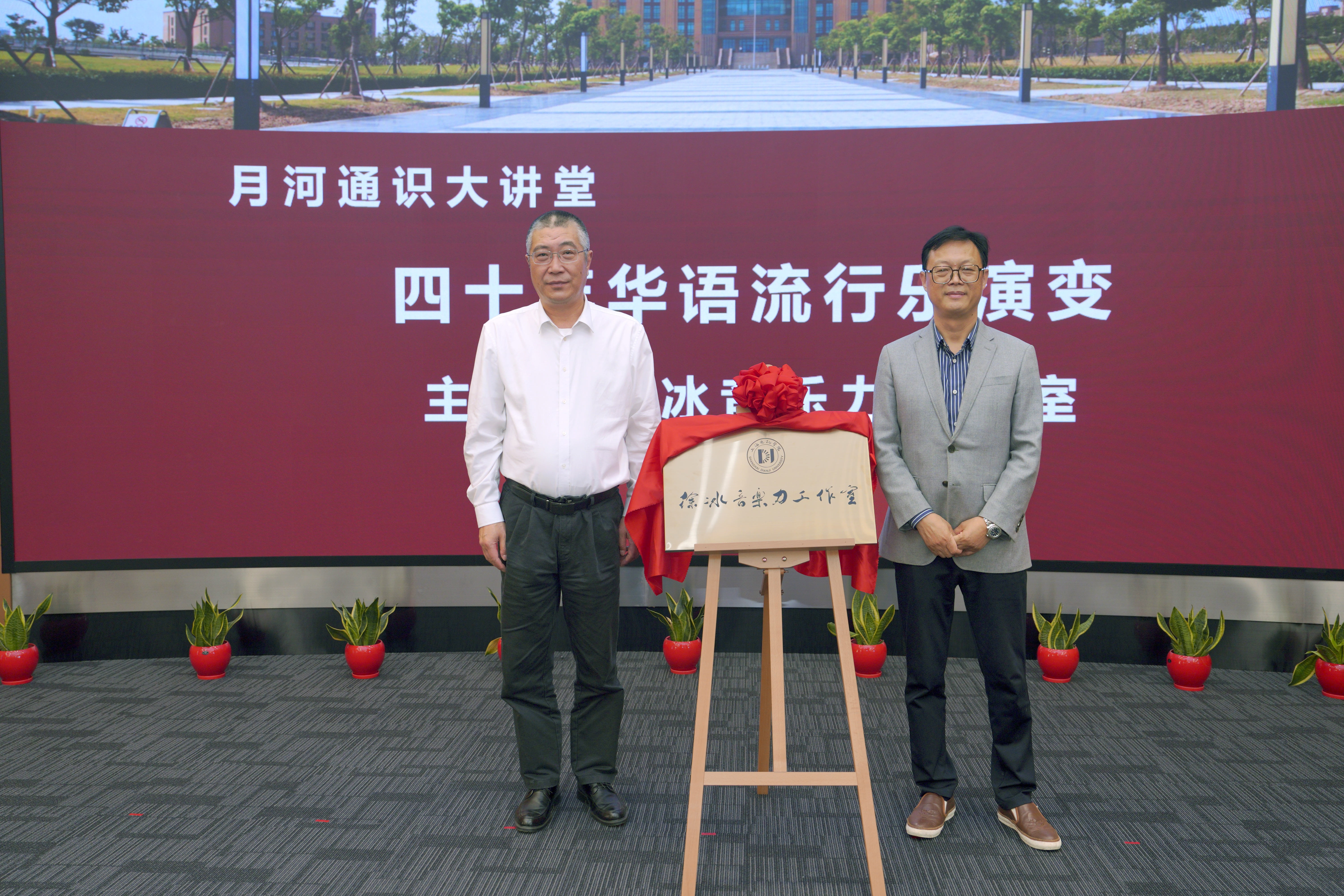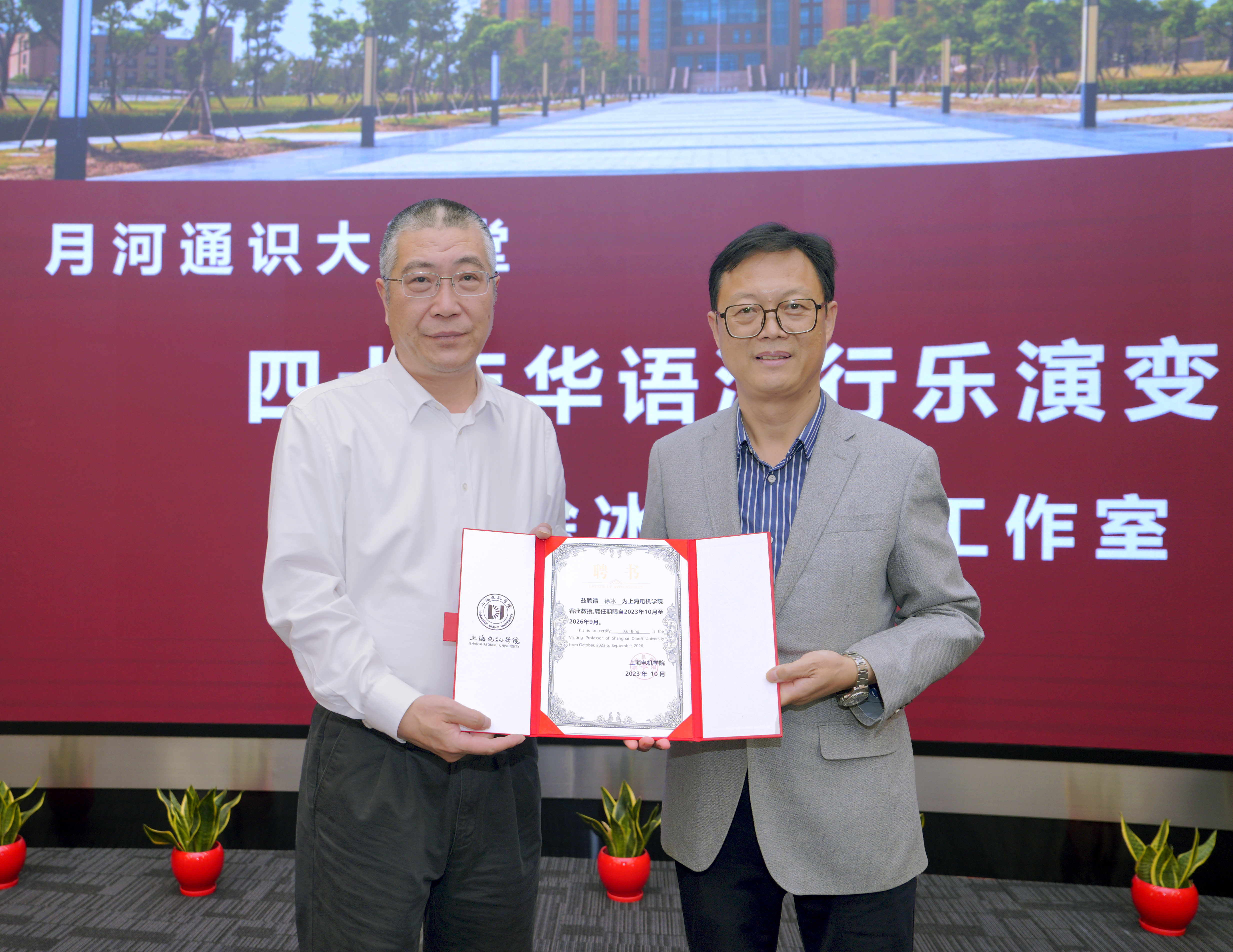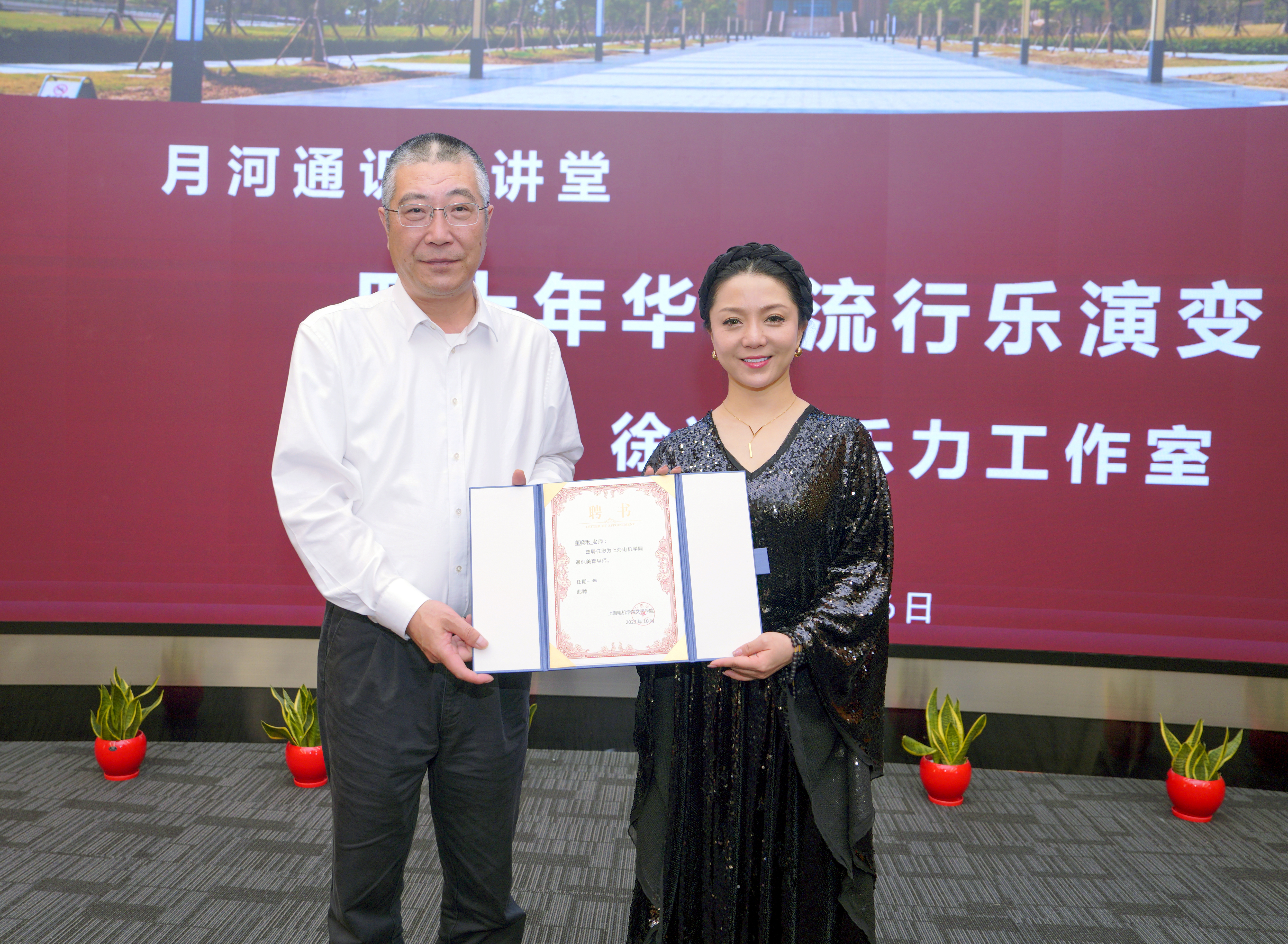 讲座伊始,学校举行聘任仪式,杨万枫分别为徐冰、董晓禾颁发上海电机学院客座教授、上海电机学院通识美育导师证书,杨万枫和徐冰共同为“徐冰音乐力工作室”揭牌。“徐冰音乐力工作室”将入驻学校新建的“文理馨课栈”,致力将音乐体验和音乐实践活动引入我校,把音乐魅力转化为校园文化软实力,丰富大学生校园生活。