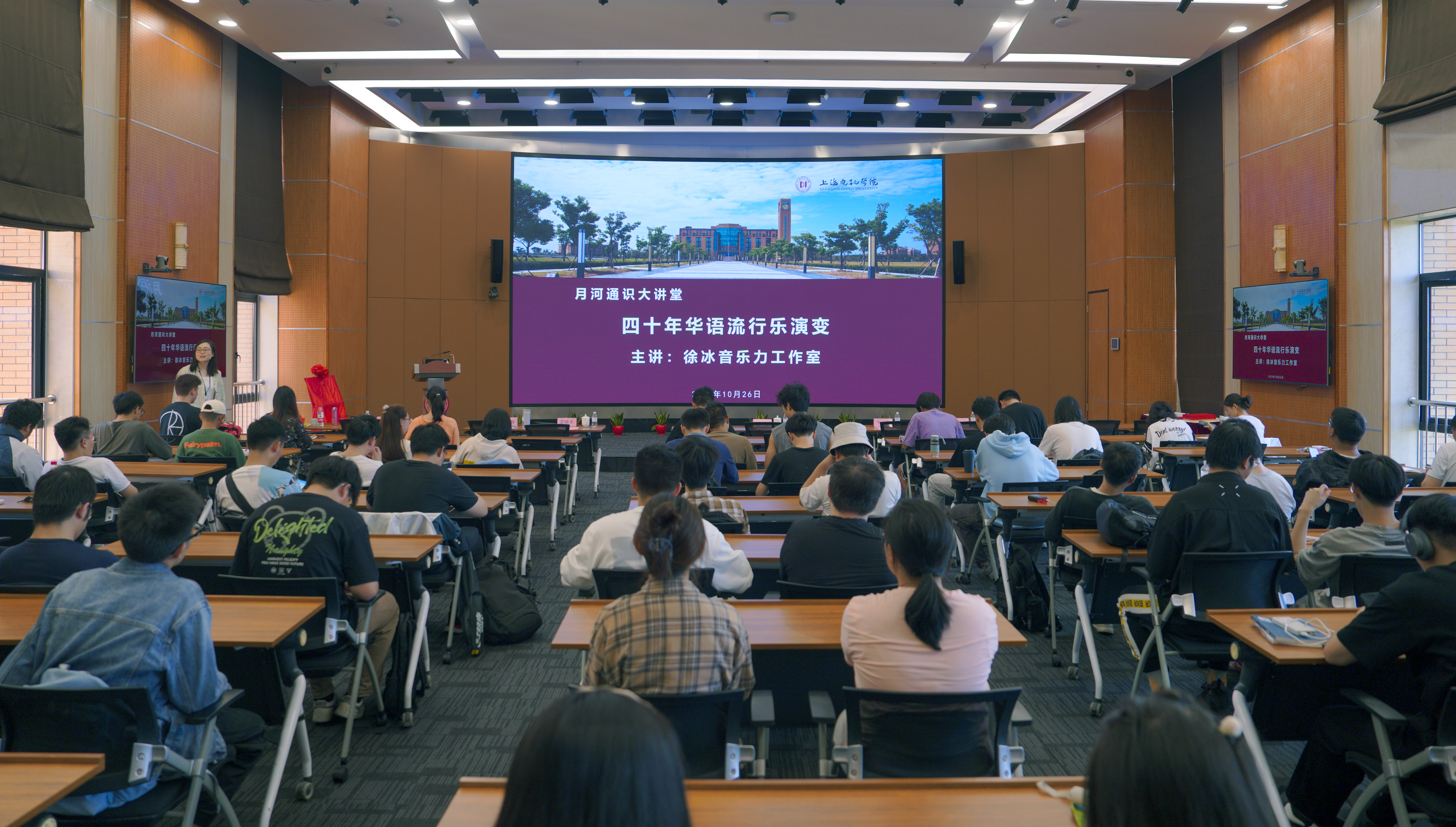 10月27日,“月河通识大讲堂”本学期首场讲座邀请我校校友、中国音乐家协会会员、中国流行音乐学会理事、上海黑胶文化研究专业委员会会长、上海古凡交响乐团首席策划徐冰,著名唱作人、上海古凡交响乐团特邀歌手董晓禾在行政楼330带来题为《四十年华语流行乐演变》的主题讲座。副校长杨万枫,对外联络处处长、校友会办公室主任卞一明,文理学院直属党支部书记董雪静等出席,活动由文理学院副院长吉文斌主持。全校一百余名师生沉浸其中,以音乐为载体,触摸时代力量、感受创作初心。