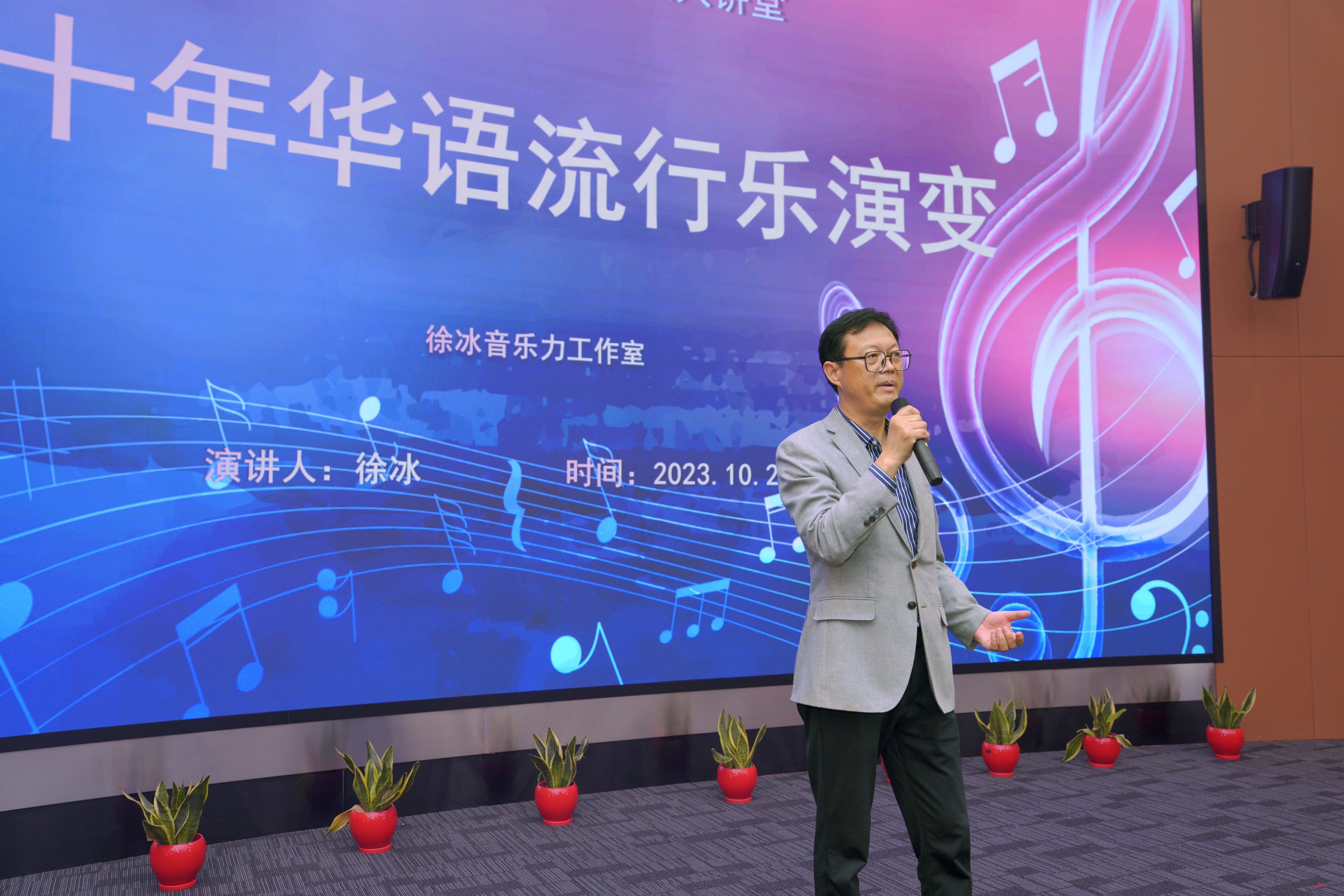 讲座中,徐冰老师作为亲历者和参与者,将四十年华语流行乐的演变凝练为开放气态下的明媚之光、唱片工业的辉煌时代、网络草根歌曲热潮、泛娱乐与跨界时代气象四个典型时代特征。徐老师带领同学们“回到”40年前,讲述了流行歌曲从一开始被批判为“靡靡之音”,到现在在人民大众心目中成为美好的旋律,每个人都可以哼唱;再到八十年代的校园民谣、九十年代的四大天王;再聊到新世纪的超级女声、粉丝经济、AI对音乐生态的冲击、华语流行乐是世界的关系……徐老师作为40年来内地流行乐的活目录,信手拈来,便是一段精致的妙语点评,他说道:“在改革开放以前的上海民间,上海话我们叫‘老克拉’,私下里喜欢抱着吉他,在音乐厅里演唱一些当年的欧美流行歌曲,流行音乐的传承就没有断过;1979年改革开放开始,上海的流行音乐之传承,更有了一个发扬光大的理由。”