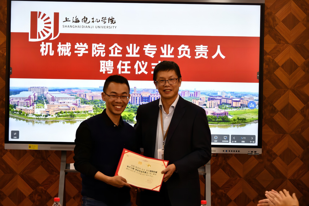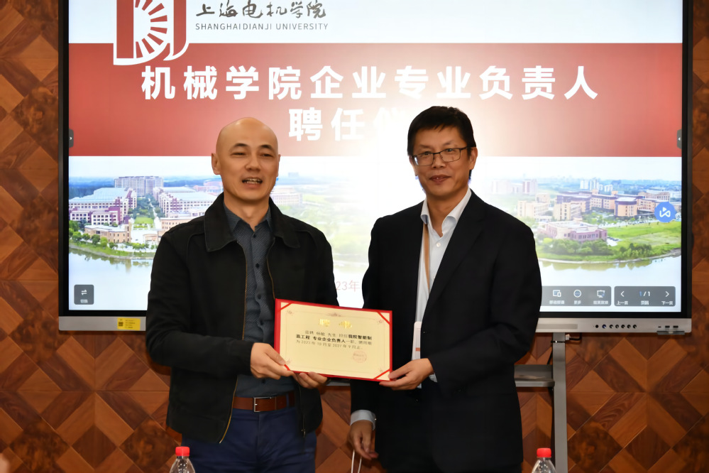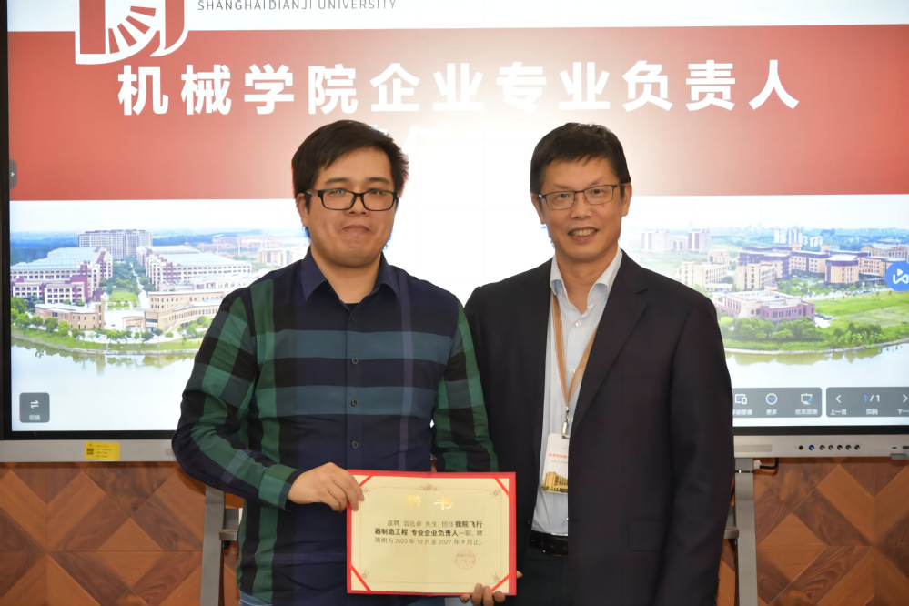 会上接着,刘军院长为企业专业负责人颁发聘书,聘任上海第一机床厂有限公司党委书记楼杭飞为机械设计制造及其自动化企业专业负责人;聘任中科新松研发中心研发部经理陈宏伟为机械电子工程企业专业负责人;聘任中汽研汽车科技(上海)有限公司总经理郭润清为车辆工程企业专业负责人;聘任上海犀浦智能系统有限公司副总经理杨敏为智能制造工企业专业负责人;聘任上海友道智途科技有限公司整车工程中心总经理毛向阳为新能源汽车工程企业专业负责人;聘任上海飞机制造有限责任公司ARJ事业部技术部部长翁远卓为飞行器制造工程企业专业负责人。刘军院长为上述企业专业负责人颁发聘书。