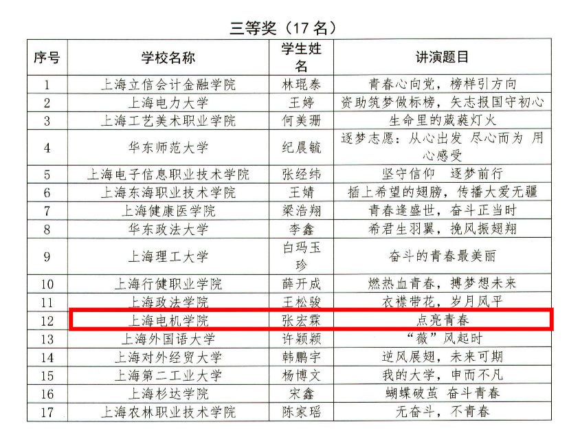 近日,由上海市教育委员会指导,上海市学生事务中心主办的第二届“谁的青春不奋斗”上海高校学生故事讲演大赛及“我为资助代言”第六届上海高校十佳学生资助宣传大使评选活动结果公布。我校张宏霖同学获上海高校学生故事讲演大赛三等奖,张正甜同学获上海高校十佳学生资助宣传大使评选活动三等奖。
