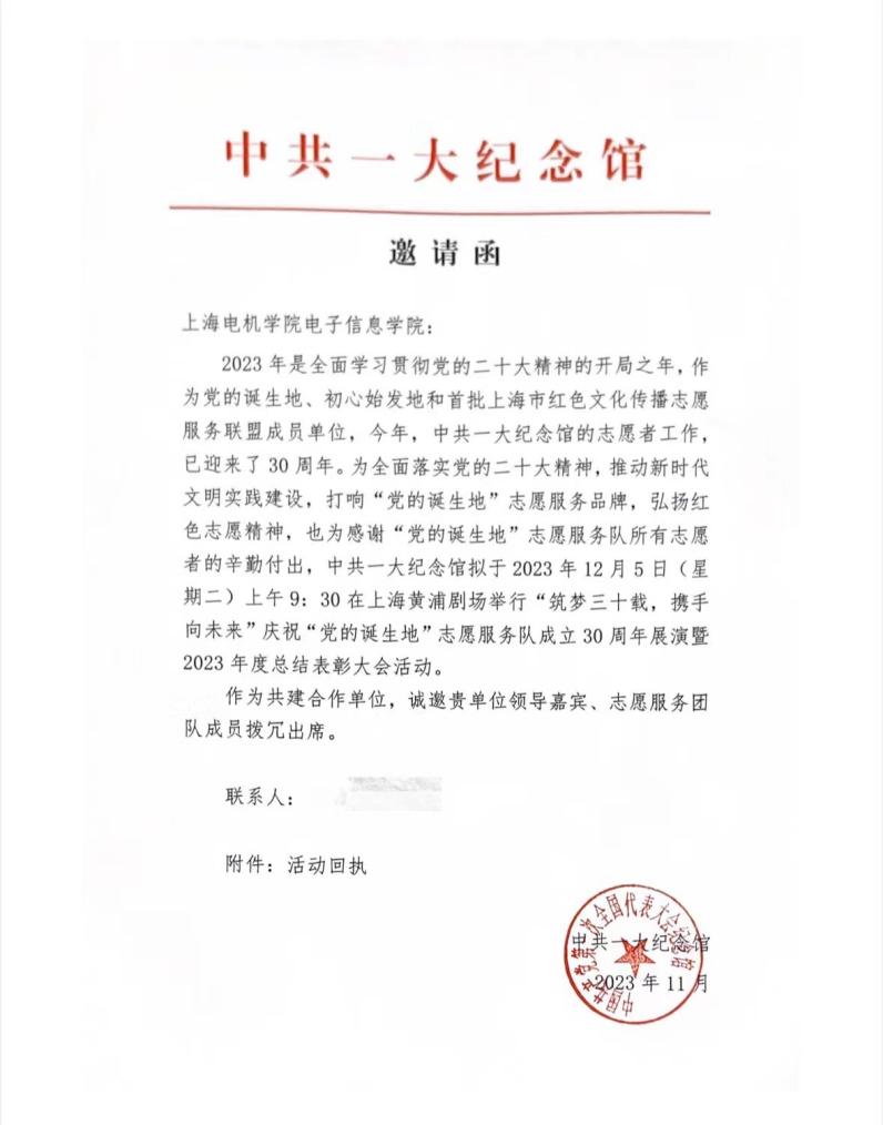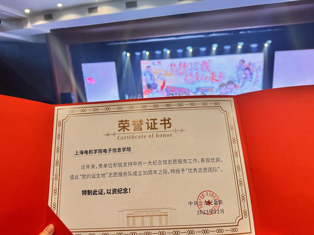 本次活动以“筑梦三十载,携手向未来”为主题,通过“初心 • 守承诺”“梦想 • 共成长”“传承 • 向未来”三个篇章,回顾了志愿服务队30年来的发展历程,表彰了一批优秀的志愿者和志愿团队。一直以来,电子信息学院学生学以致用,利用自身专业知识和技能专长积极投身于中共一大纪念馆志愿服务中,协助场馆网络设备运维、数字纪念馆等设备运维工作,在此次2023年度总结表彰大会中,我院获评中共一大纪念馆“优秀志愿团队”荣誉称号。