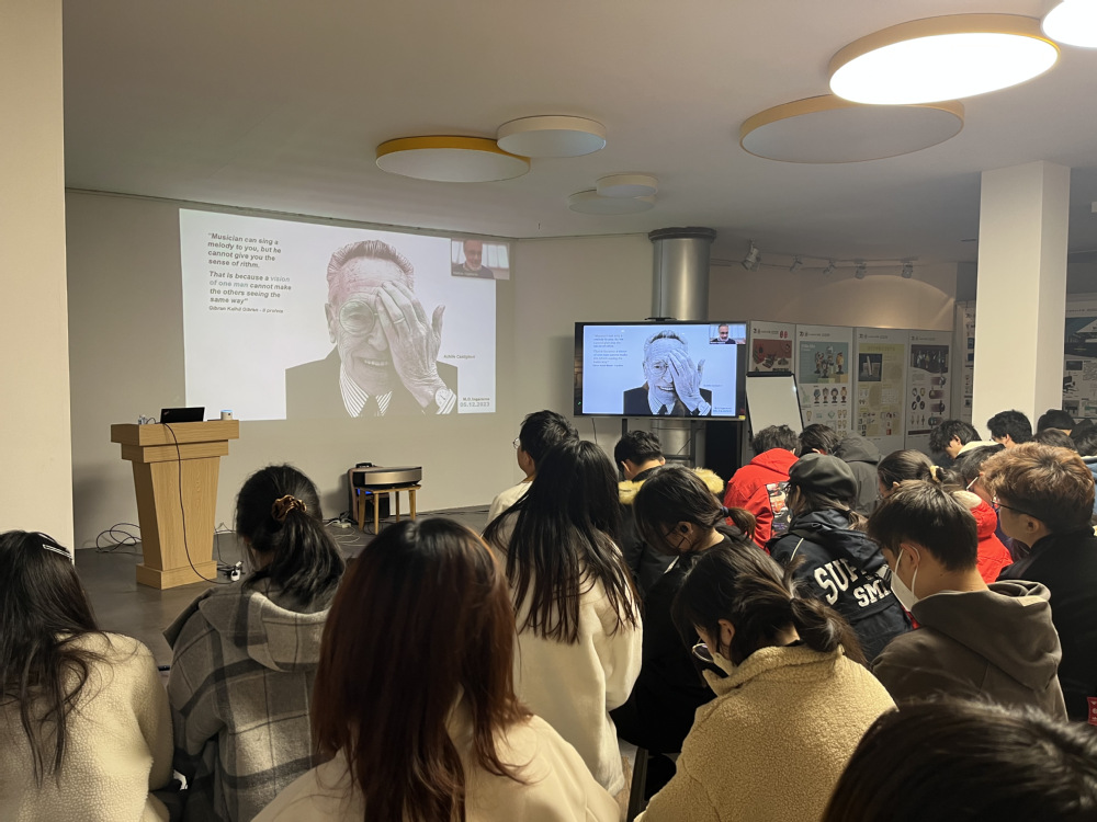 会上Matteo O. Ingaramo教授以“设计的故事”为主题,向学生展示了意大利设计的悠久历史,从文艺复兴时期的艺术到现代设计,再到当代的先锋设计,意大利的设计传统与风格始终贯穿其中。他指出,设计不仅是创新与美学的体现,更是解决问题、满足需求的方式。在讲解设计前沿案例时,Matteo教授选取了几个具有代表性的案例,一款能自动适应不同环境的光源设计以及一款能够预防运动损伤的运动鞋设计。这些案例充分展示了意大利设计师们在面对社会问题和需求时的敏锐洞察力和创新实践能力。