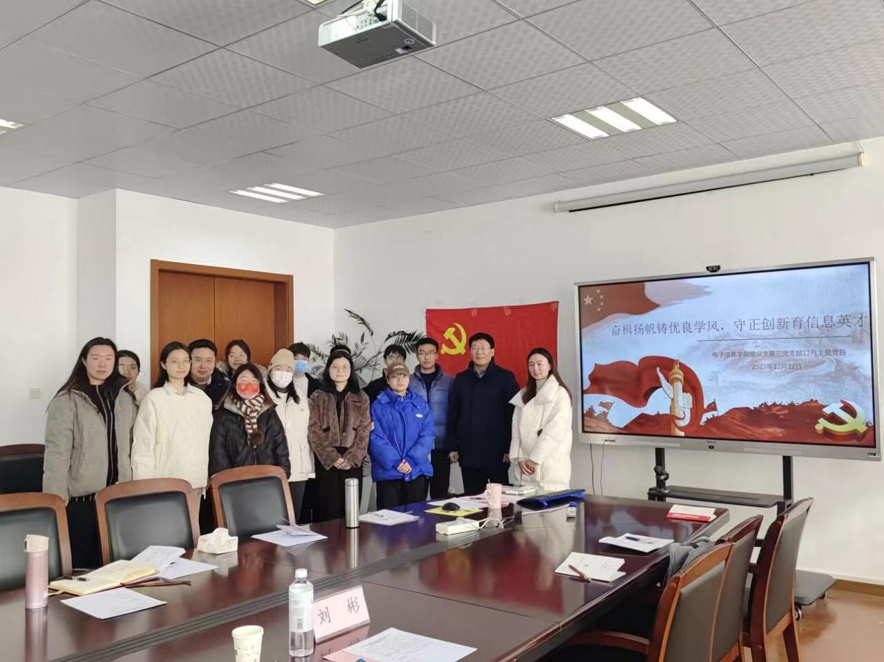 12月22日上午,电子信息学院第三党支部在信息楼503会议室召开12月主题党日,本次活动主题为“奋楫扬帆铸优良学风,守正创新育信息英才”,上海电机学院党委副书记、纪委书记刘彬受邀莅临现场指导。