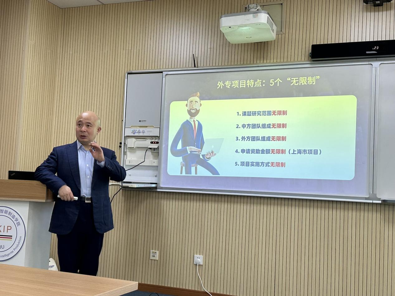 潘涛老师在项目申报及管理方面有丰富的经验,讲座从上海市科委项目和科技部两类外国专家项目申报入手,以上海理工大学为例,细致讲解了项目的特点、申报的注意事项等,并和凯劳智能制造学院的老师们进行了热烈地讨论答疑。