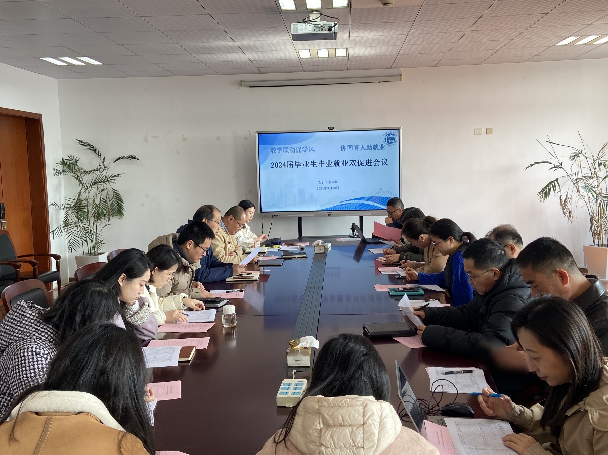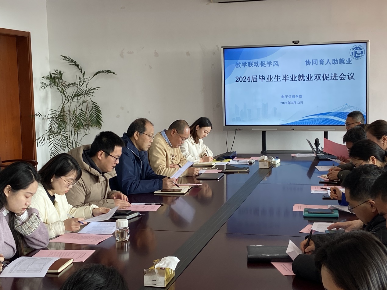 为营造良好学风、更好推进毕业生就业工作,3月13日上午,电子信息学院召开“教学联动促学风 协同育人助就业”——2024届毕业生毕业就业双促进专题会议。学院党政领导、系部主任、专业负责人、毕业班班主任、全体辅导员等20余人参会,会议由党总支副书记副院长袁亮主持。