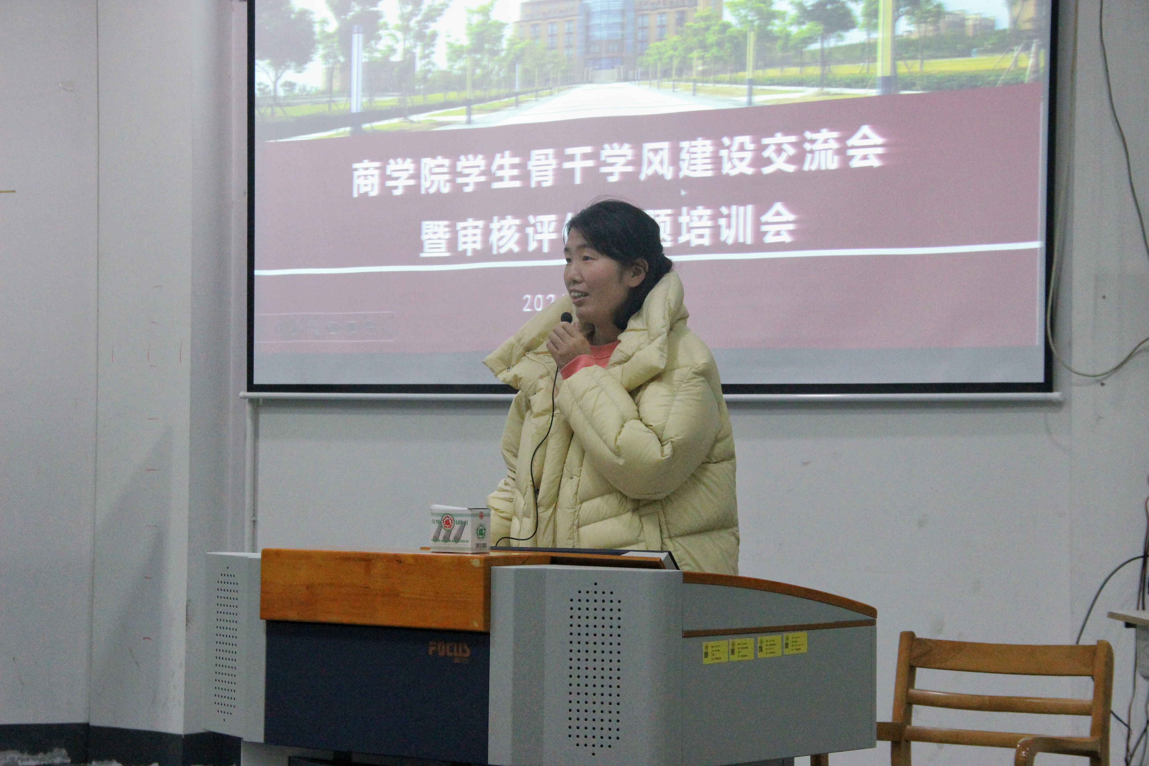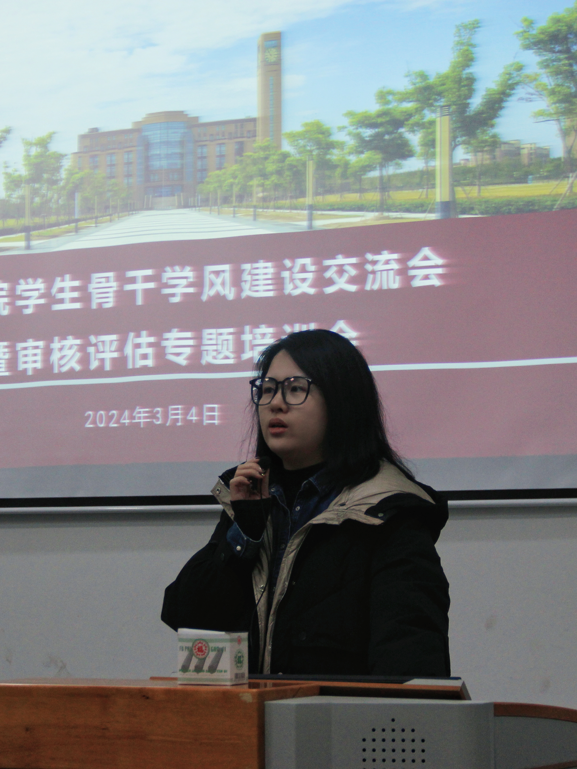本次会议由商学院团总支书记桑子轶老师主持,桑老师通过讲解学院学风建设的持续发展意义,以及审核评估中学生干部应发挥的榜样力量开始本次会议。