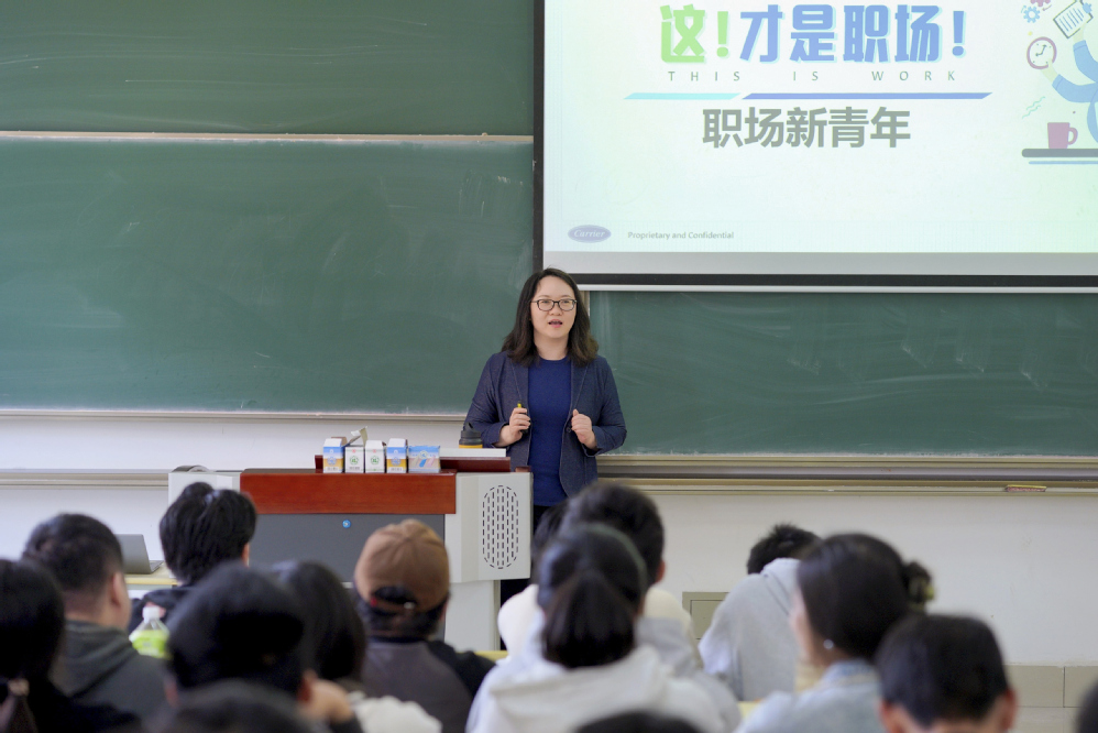 活动中,周可佳做了“职场新青年”的主旨演讲,结合自己职业发展成长的经历,以问题互动、故事盲盒等形式分享了对青年职业选择、职业素养、职业竞争力的看法以及开利的企业文化。她认为,大学期间要积累的基本素质包括学习、视野、实践、能力、敏捷度、意愿以及尊重、包容、诚信、创新、卓越的品质等。