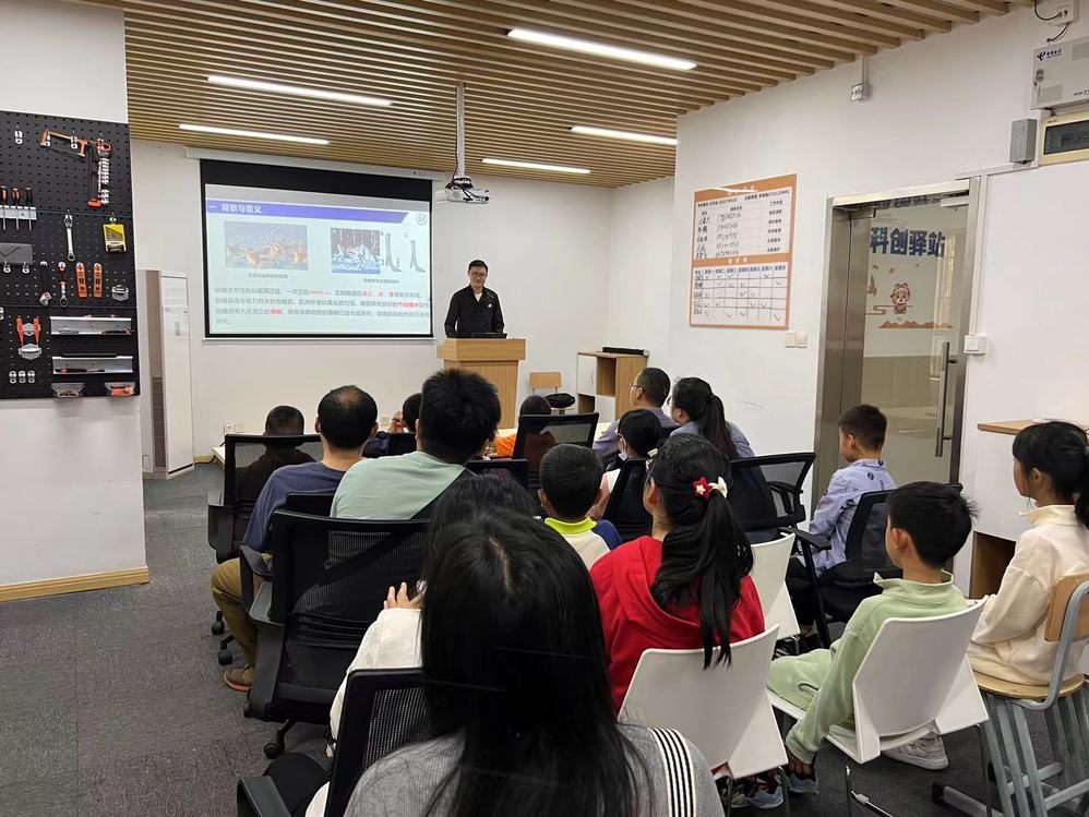 活动伊始,由机械学院李国玉老师在学院科创驿站为青少年们讲授“在仿生学中探机械奥秘”主题科普讲座。李老师从驯鹿运动时体态变化引申到机械原理,为大家讲述蕴藏在大自然中的科学与机械奥秘,鼓励他们要善于发现生活中的独特现象,善于观察、积极思考,将想法勇敢付诸实践。