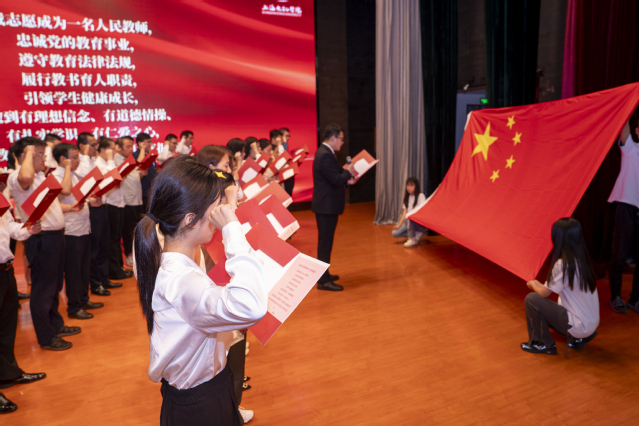 会上举行了新进教师入职宣誓仪式。40余名新教师在领誓人金敏教授的带领下,面向国旗庄严宣誓:“我志愿成为一名人民教师,忠诚党的教育事业……”