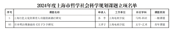 2024年度上海市哲学社会科学规划课题设一般课题、青年课题两类,苏李老师申报的“上海红色文化资源育人功能创新路径研究”获批马列-科社学科的一般课题;王泽宇老师申报的“日本明治维新前的《庄子》学研究”获批文学-艺术学科的青年课题。