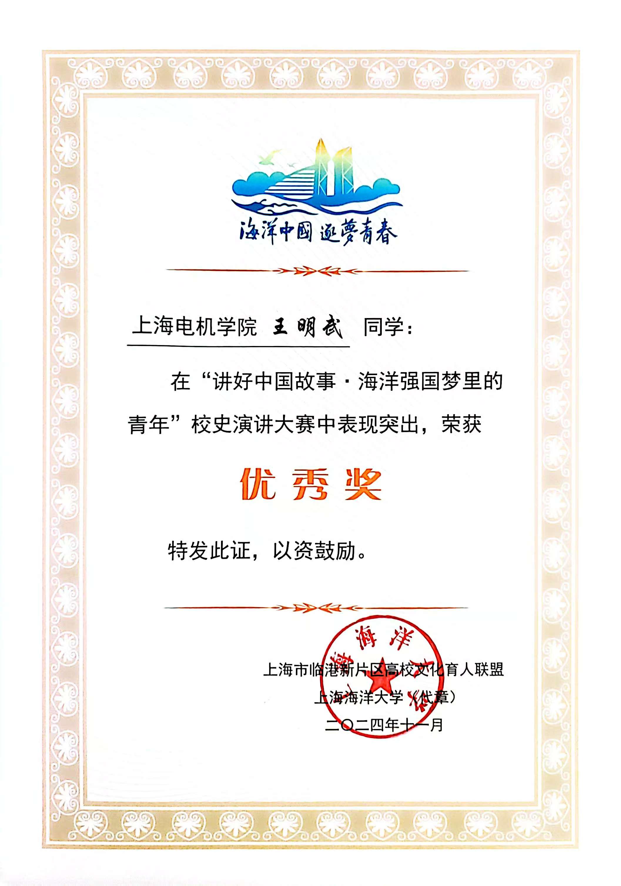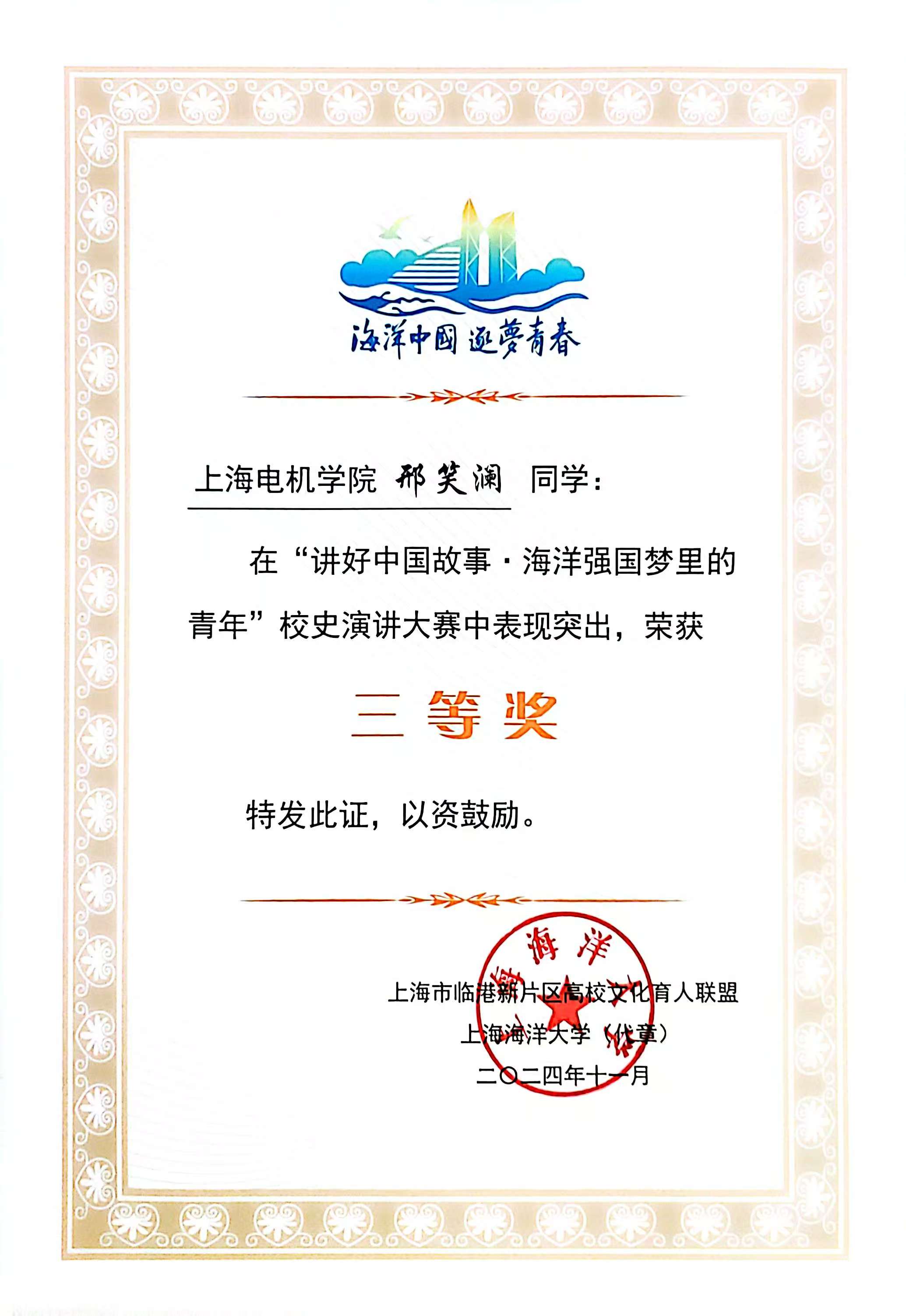 我校在本次活动中荣获优秀组织奖,我校学子在“讲好中国故事-海洋强国梦里的青年校史演讲大赛”中分别荣获三等奖和优秀奖。(上海电机学院校史馆)