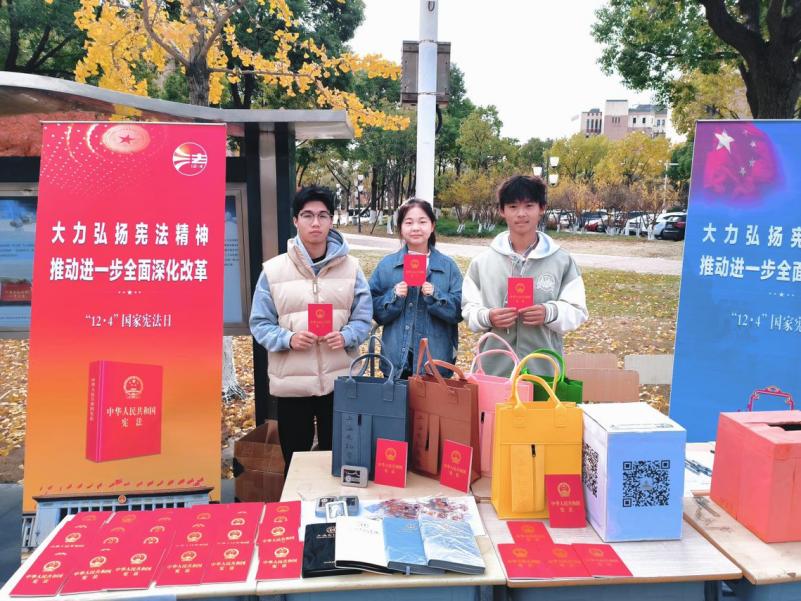 开展宪法现场宣传,推动宪法深入人心。学校在临港校区半月广场设立了宪法知识宣传点,组织普法志愿者开展了一系列丰富多彩的现场活动。活动现场设置多个展区,展板内容涵盖了宪法的历史沿革、宪法的基本原则、公民的基本权利与义务等内容。工作人员热情向师生发放宪法宣传手册,耐心讲解宪法知识,用通俗易懂的语言引导大家树立宪法至上的法治观念。现场还特别设置了宪法知识竞答和抽奖环节、发放普法宣传品吸引了百余名师生参与,让师生在互动中受到法治熏陶、获取法律知识。