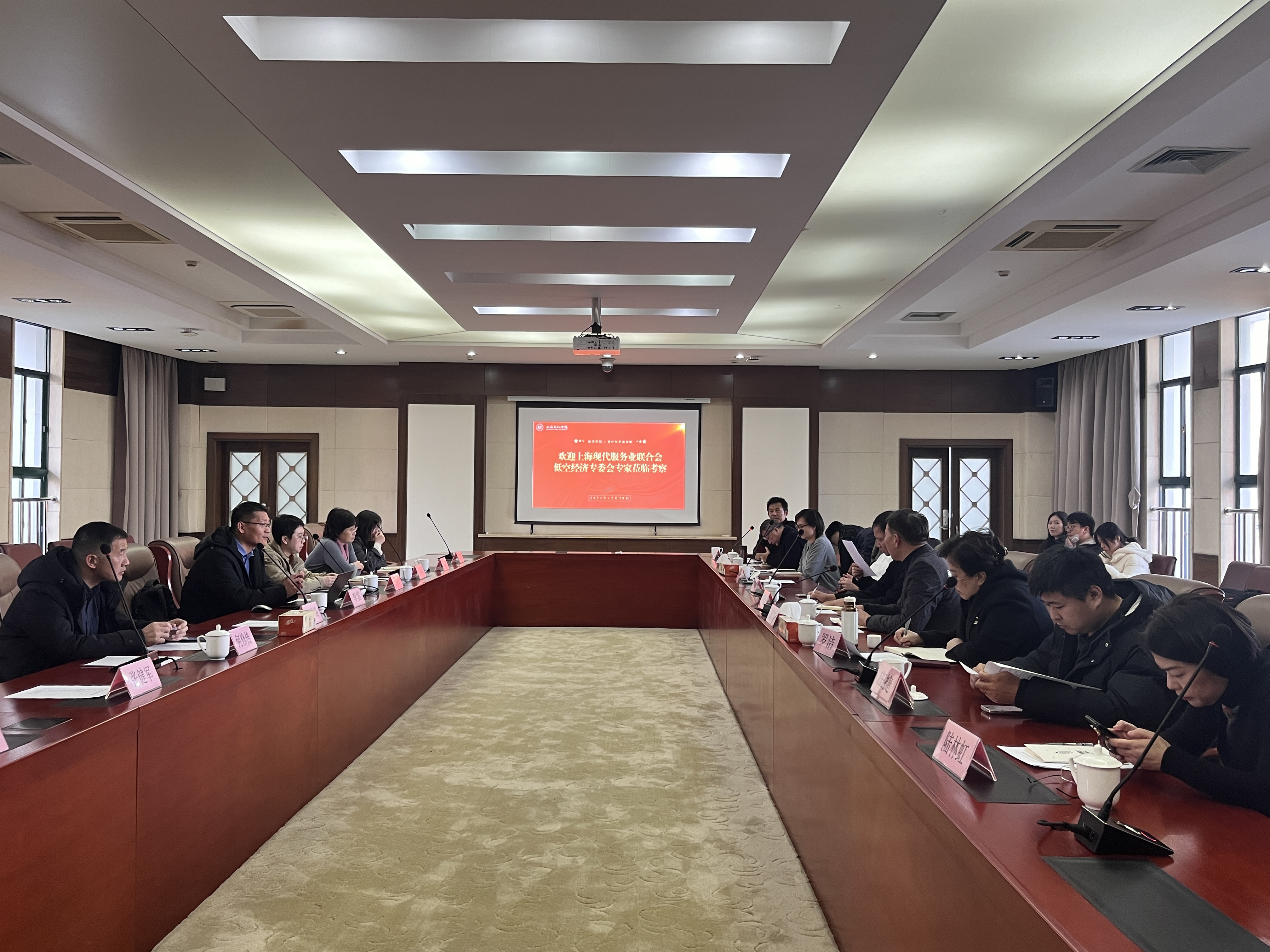 12月20日,上海现代服务业联合会低空经济服务专业委员会主任朱州龙一行考察我校闵行校区,并与航空学院、设计与艺术学院深入探讨合作。专家组李锦铭、何法江、鲍冠生等共同参与调研,并给出专业性指导意见。航空学院执行院长李雷与设计与艺术学院何修传、刘成等陪同接待。