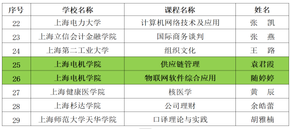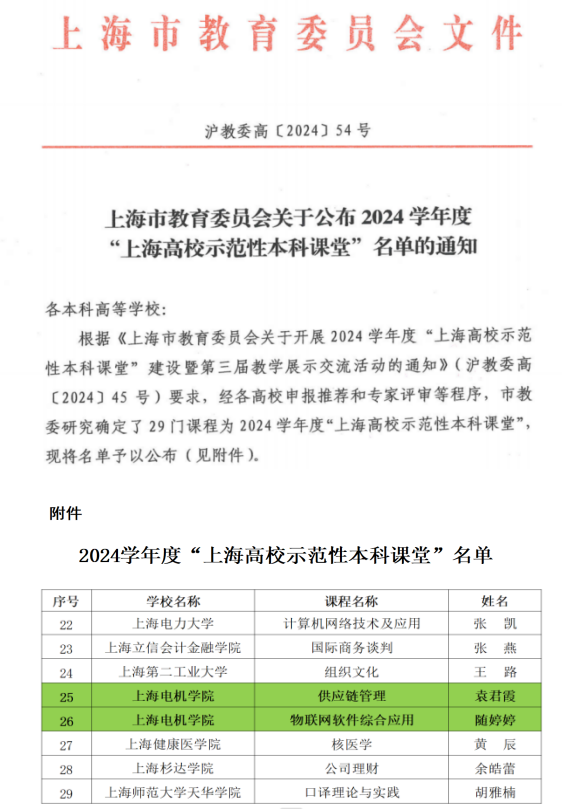 在上海市教育委员会最新公布的2024学年度“上海高校示范性本科课堂”名单中,我校推送由商学院袁君霞老师负责的《供应链管理》、电子信息学院随婷婷老师负责的《物联网软件综合应用》两门课程,双双荣获“上海高校示范性本科课堂”称号,这是我校首次荣获该称号。