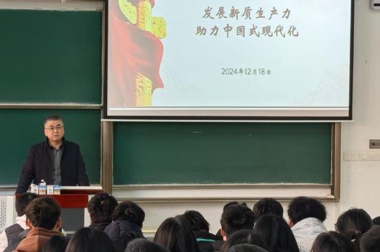 12月18日,副院长王志恒走进马克思主义学院张鑫敏老师的课堂,带来了题为“发展新质生产力,助力中国式现代化”的主题报告。王志恒首先从经济发展的形势、科技革命的态势、中美关系的局势、全球气候变化的趋势等四个方面向同学们描述了当前我国经济社会发展面临的挑战,并从资源、资金、劳动力等生产要素的变化向同学们说明了传统经济增长模式的不可持续性,然后以如何摆脱传统经济增长模式引出新质生产力这个主题,阐述了新技术、新产业、新模式、新动能等内容,并以新制造、新服务、新业态为例,讲述了学校和临港新片区勇立潮头的改革举措,鼓励号召同学们主动投身服务国家的高质量发展。